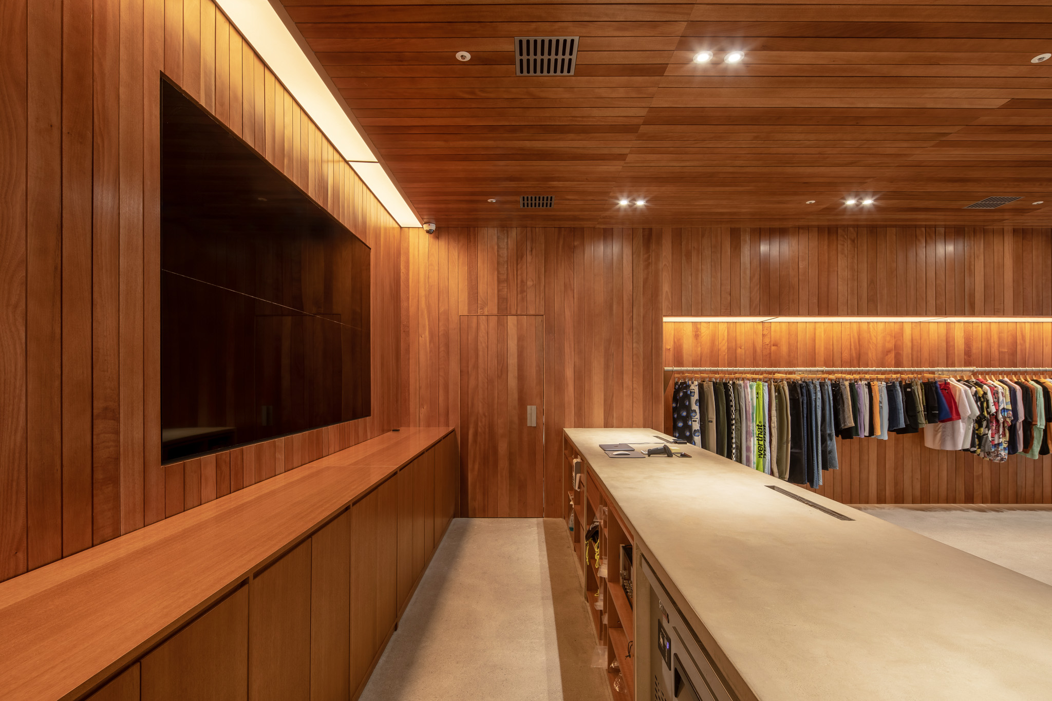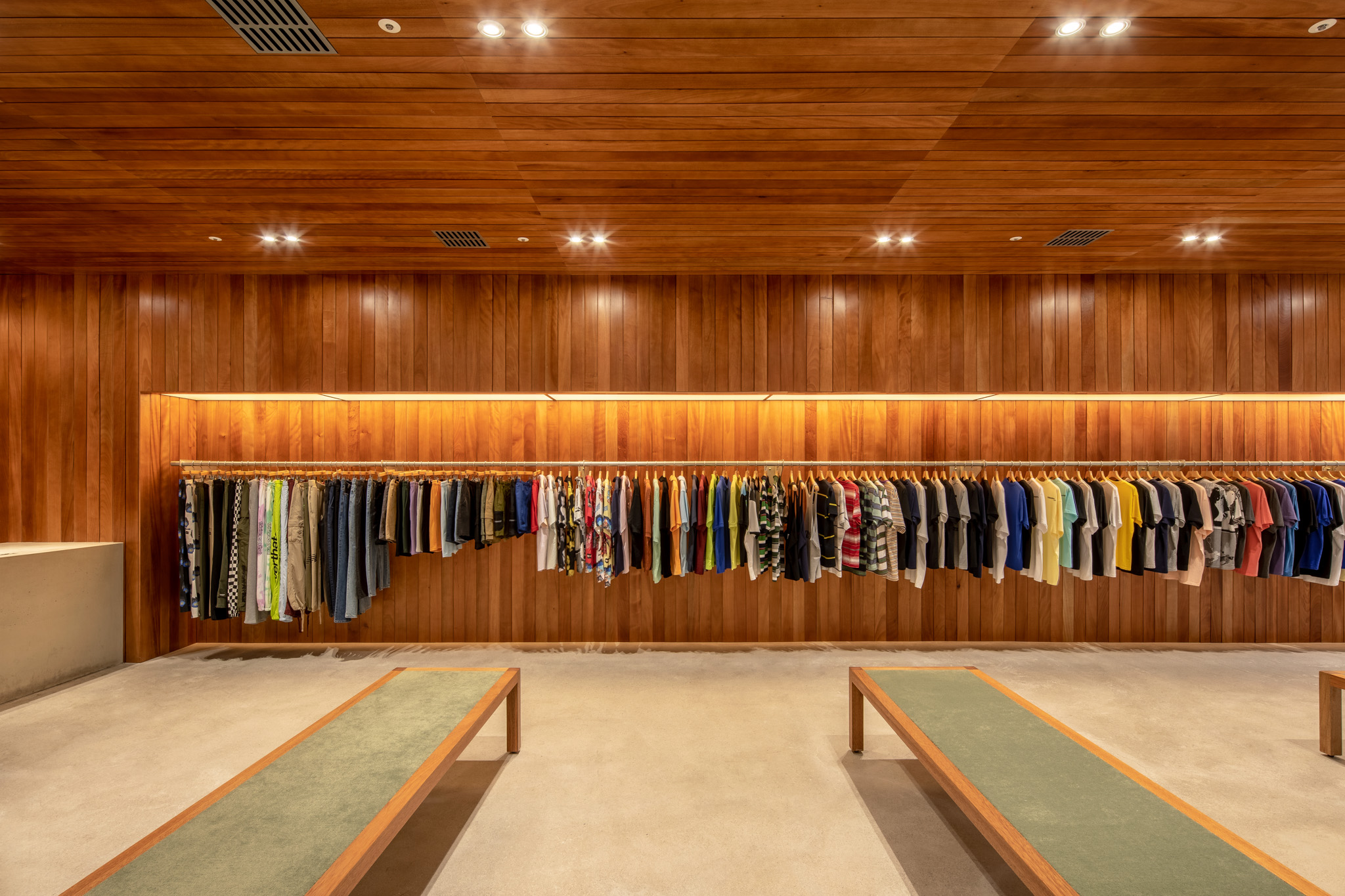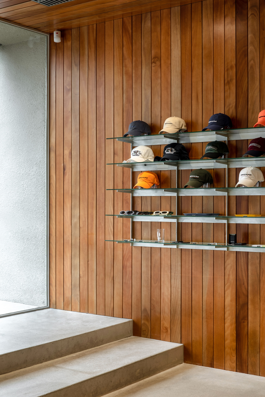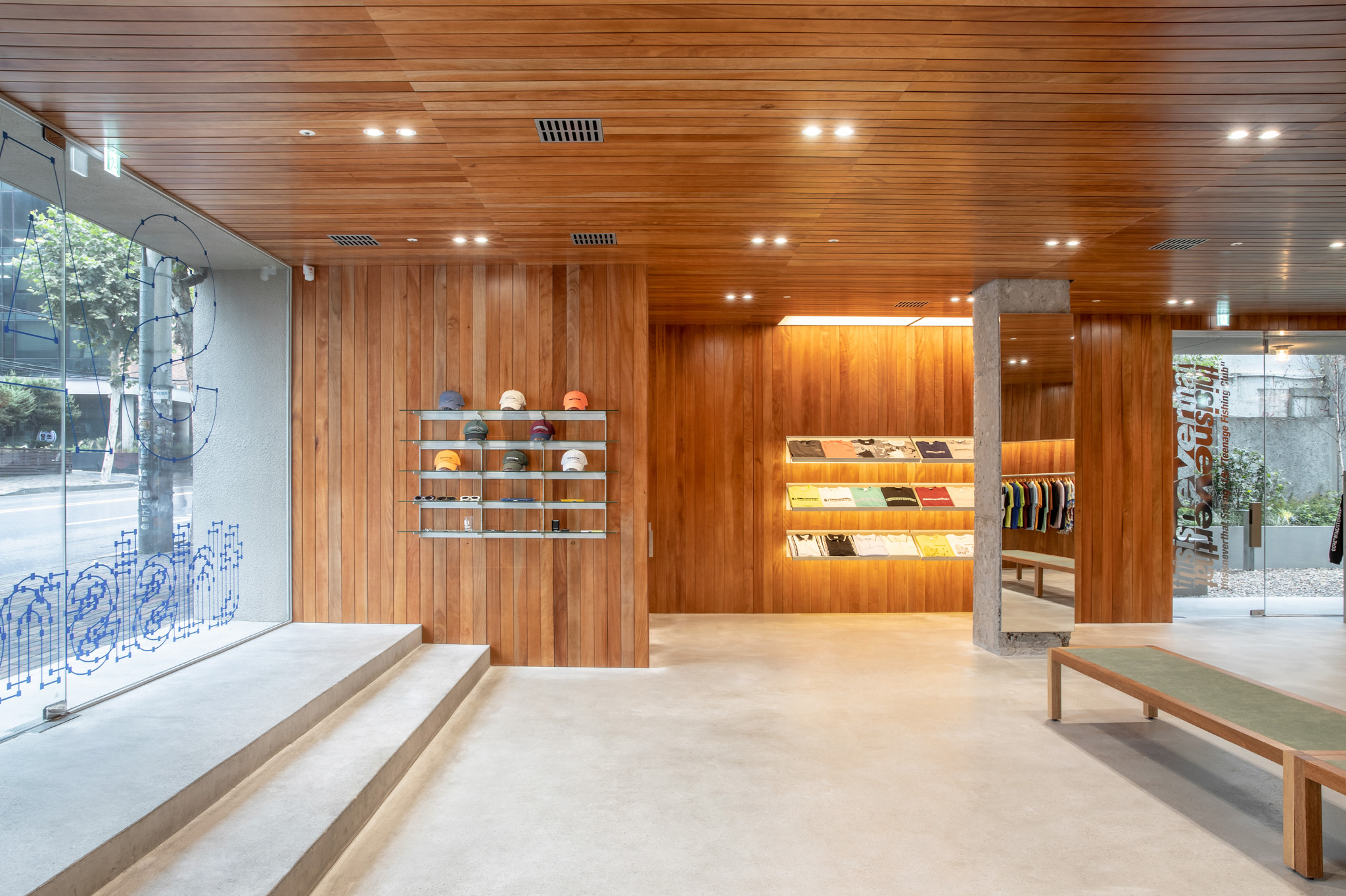 홍대에 위치한 디스이즈네버댓 플래그십 스토어. 번화가에 위치한 의류 매장 특유의 밀도 높은 제품 디스플레이에서 벗어나, 방문객과 매장 직원 모두 여유롭게 사용 가능한 공간 구성에 집중했습니다. 디자인 중요도에서 종종 후순위로 밀리곤 했던 창고를 외부에서도 볼 수 있게 넓고 쾌적하게 만들어 공간 연출의 한 요소로 삼고, 매장 가운데 벤치를 배치해 제품을 올려놓거나 방문객들이 자유롭게 쉴 수 있도록 했습니다. 자신들이 만드는 옷이 매우 쉬운 옷이라고 몇 차례 강조했던 클라이언트의 말을 떠올리며, 마찬가지로 공간도 흔히 접하는 소재인 나무와 콘크리트로 마감했습니다.