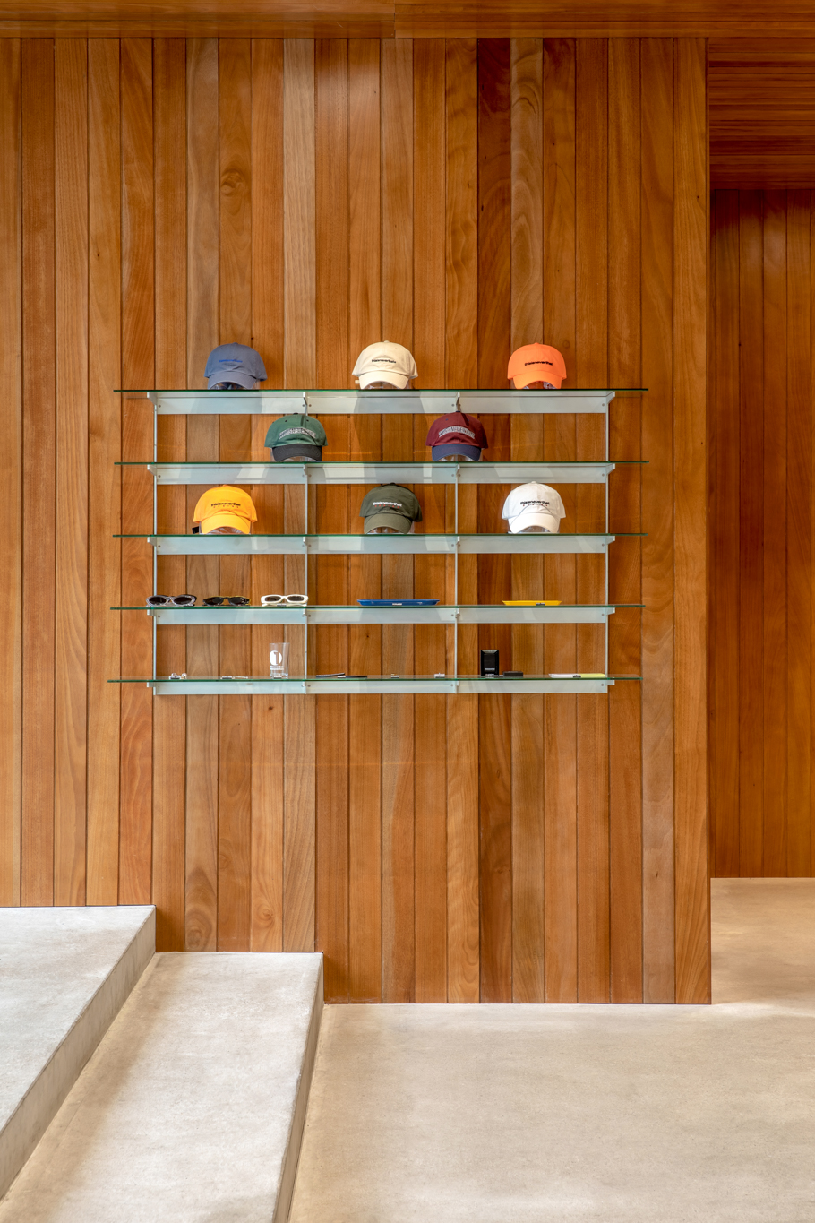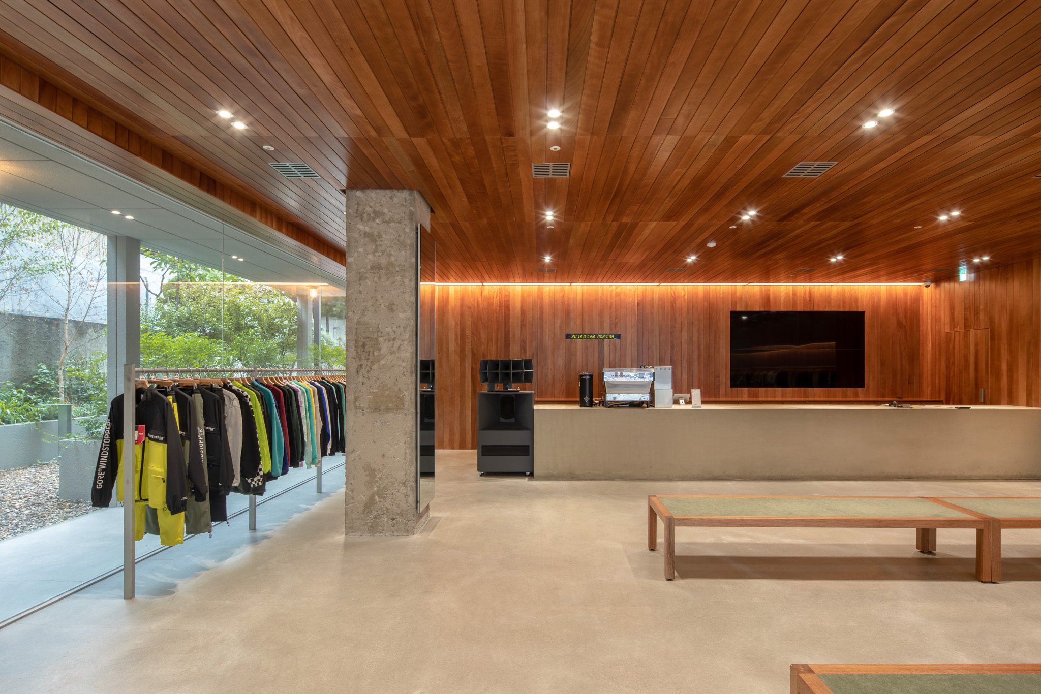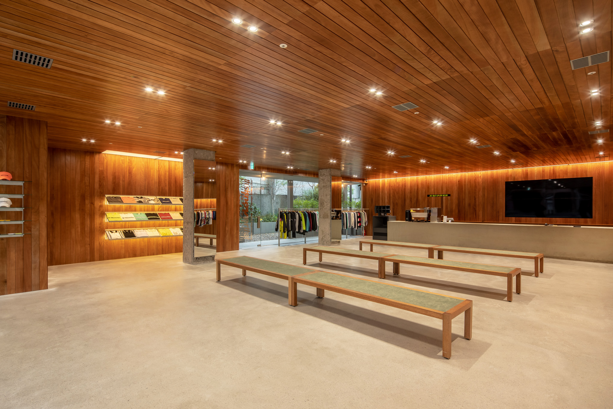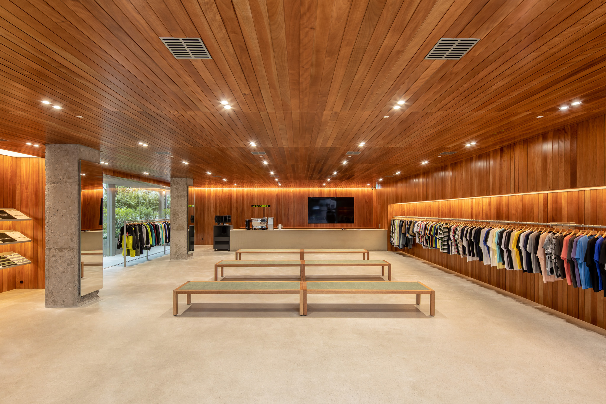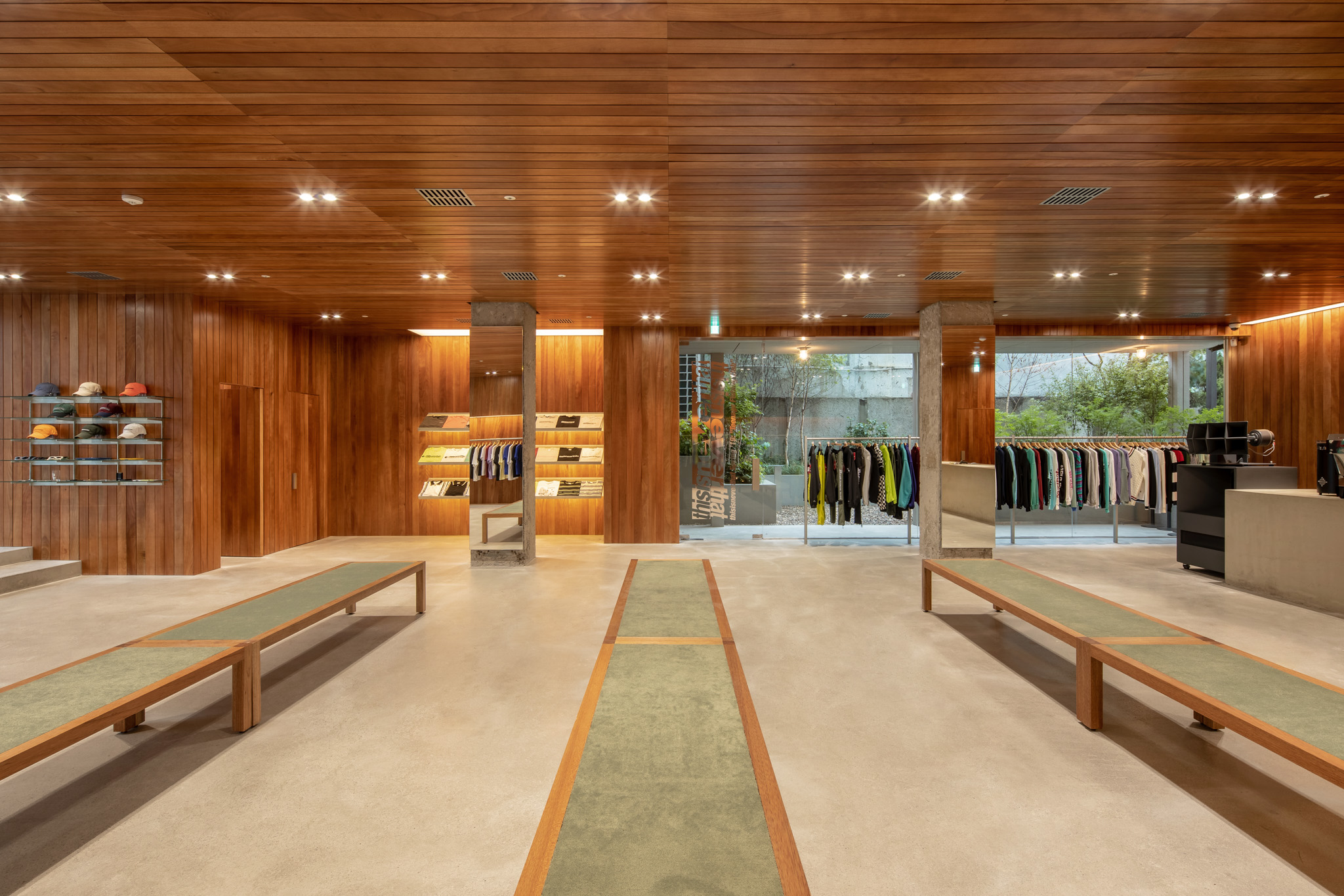 홍대에 위치한 디스이즈네버댓 플래그십 스토어. 번화가에 위치한 의류 매장 특유의 밀도 높은 제품 디스플레이에서 벗어나, 방문객과 매장 직원 모두 여유롭게 사용 가능한 공간 구성에 집중했습니다. 디자인 중요도에서 종종 후순위로 밀리곤 했던 창고를 외부에서도 볼 수 있게 넓고 쾌적하게 만들어 공간 연출의 한 요소로 삼고, 매장 가운데 벤치를 배치해 제품을 올려놓거나 방문객들이 자유롭게 쉴 수 있도록 했습니다. 자신들이 만드는 옷이 매우 쉬운 옷이라고 몇 차례 강조했던 클라이언트의 말을 떠올리며, 마찬가지로 공간도 흔히 접하는 소재인 나무와 콘크리트로 마감했습니다.