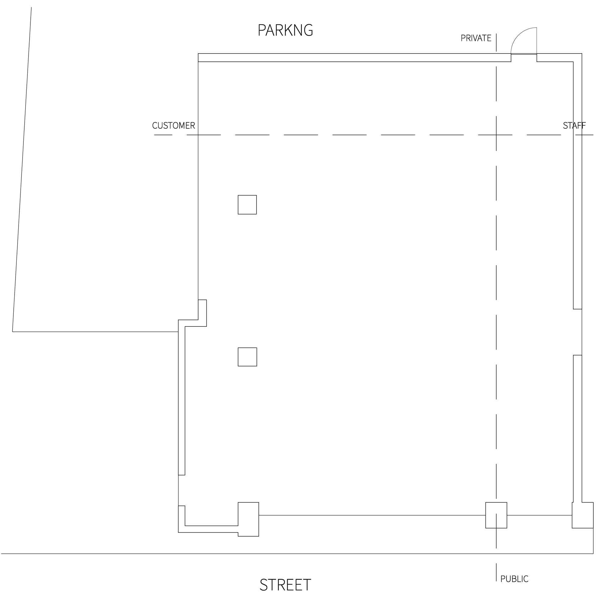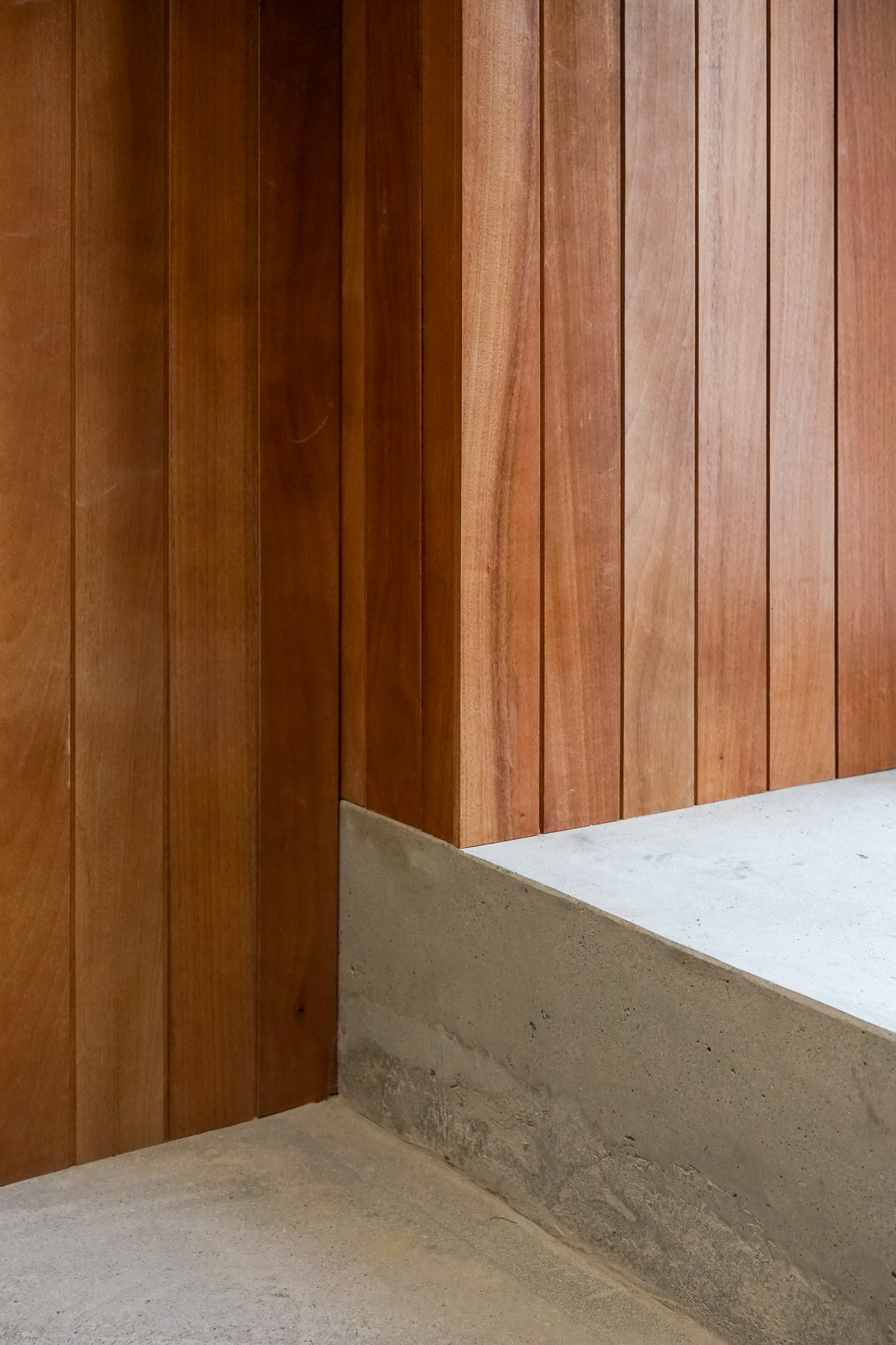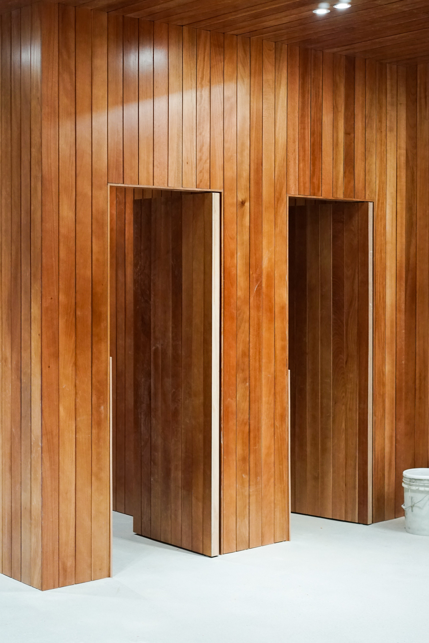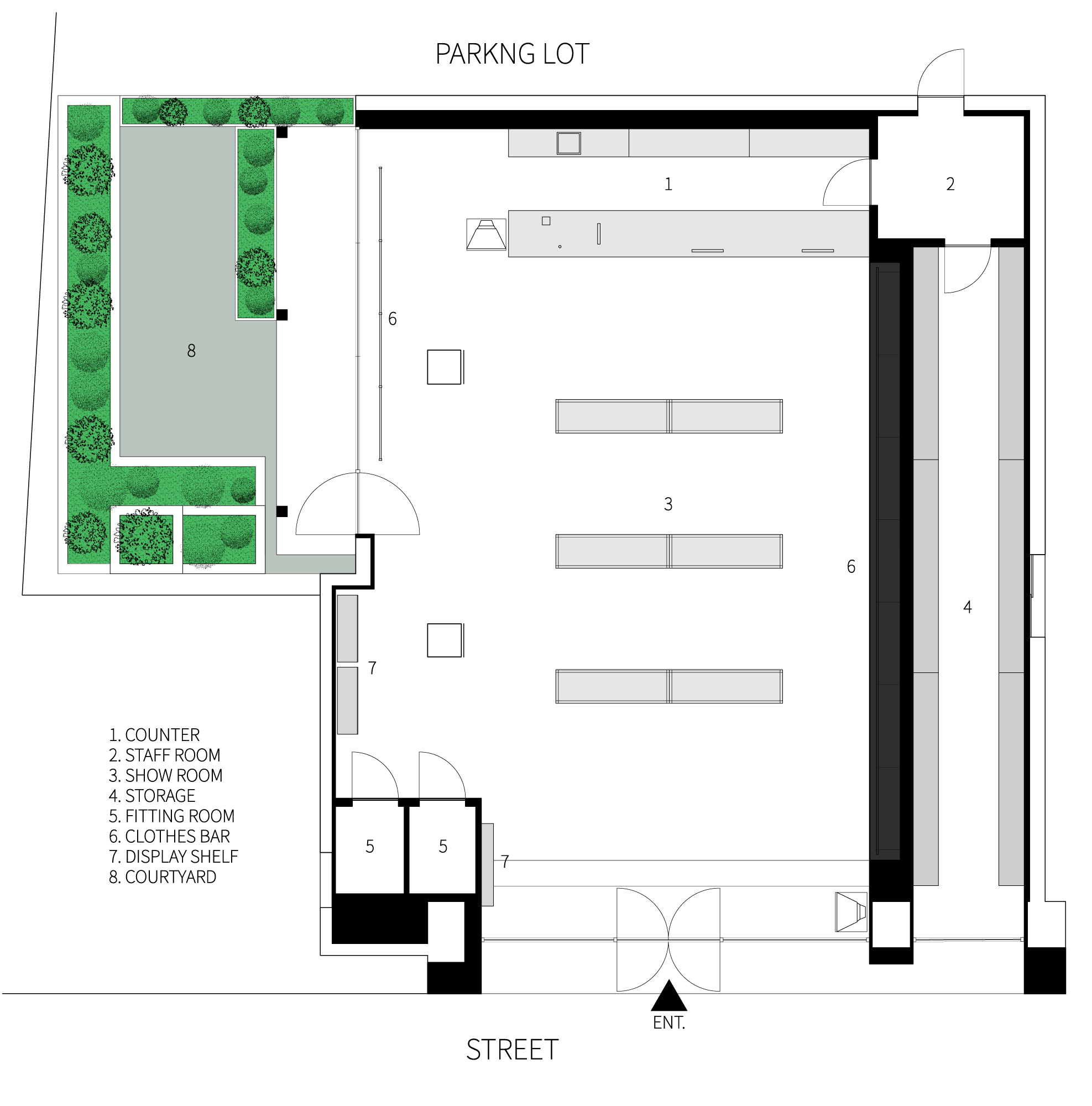 홍대에 위치한 디스이즈네버댓 플래그십 스토어. 번화가에 위치한 의류 매장 특유의 밀도 높은 제품 디스플레이에서 벗어나, 방문객과 매장 직원 모두 여유롭게 사용 가능한 공간 구성에 집중했습니다. 디자인 중요도에서 종종 후순위로 밀리곤 했던 창고를 외부에서도 볼 수 있게 넓고 쾌적하게 만들어 공간 연출의 한 요소로 삼고, 매장 가운데 벤치를 배치해 제품을 올려놓거나 방문객들이 자유롭게 쉴 수 있도록 했습니다. 자신들이 만드는 옷이 매우 쉬운 옷이라고 몇 차례 강조했던 클라이언트의 말을 떠올리며, 마찬가지로 공간도 흔히 접하는 소재인 나무와 콘크리트로 마감했습니다.