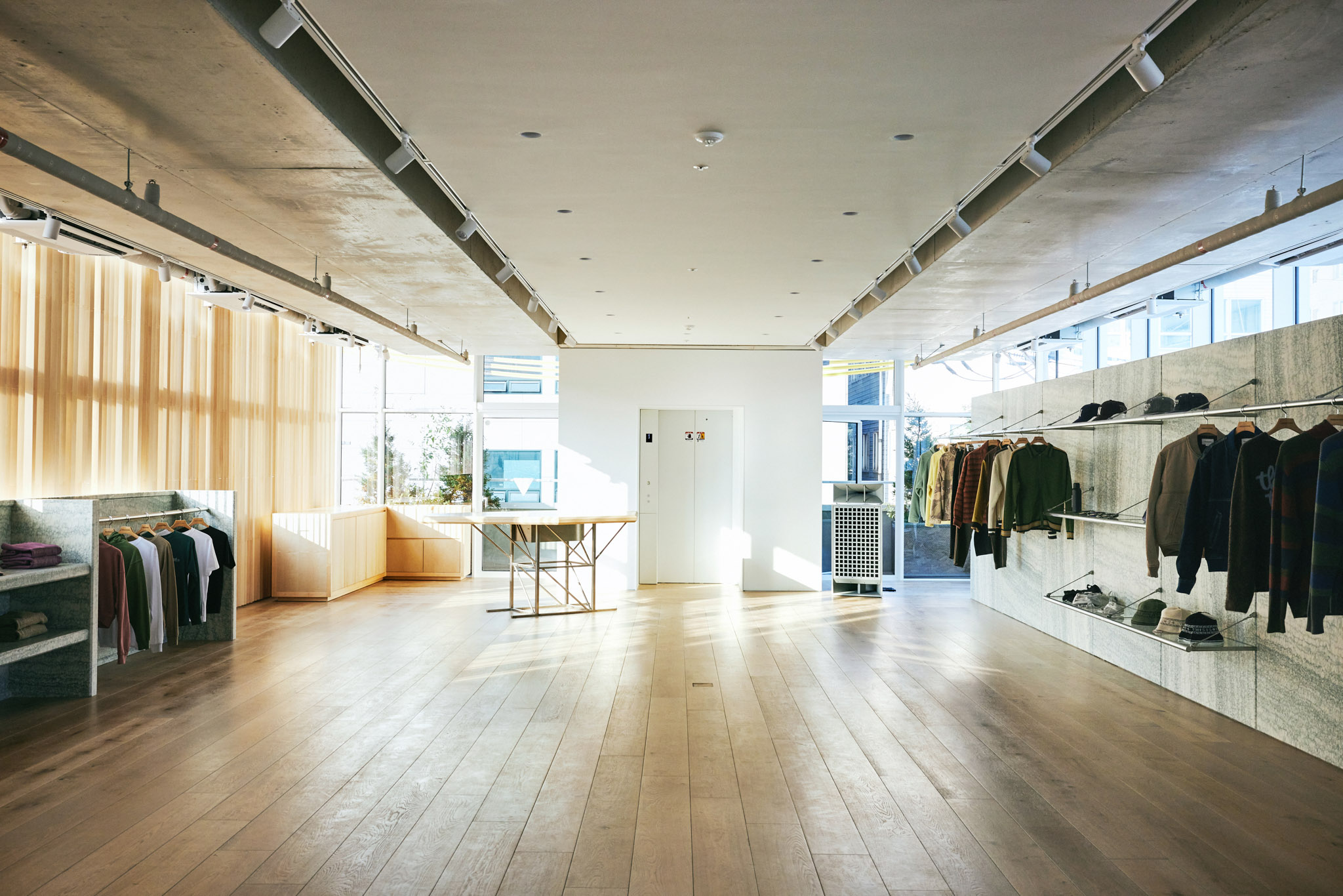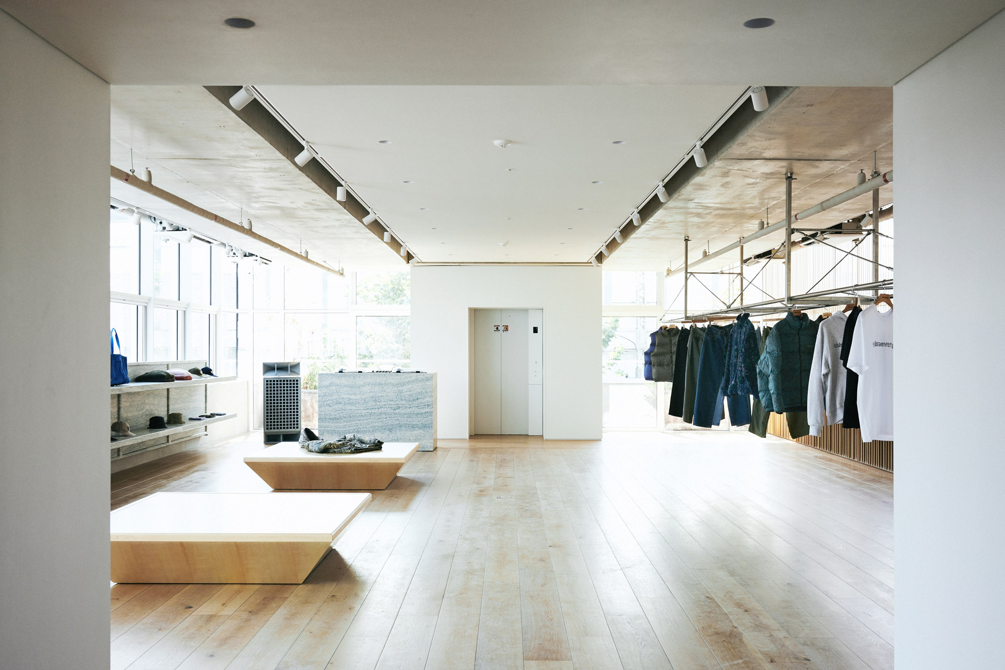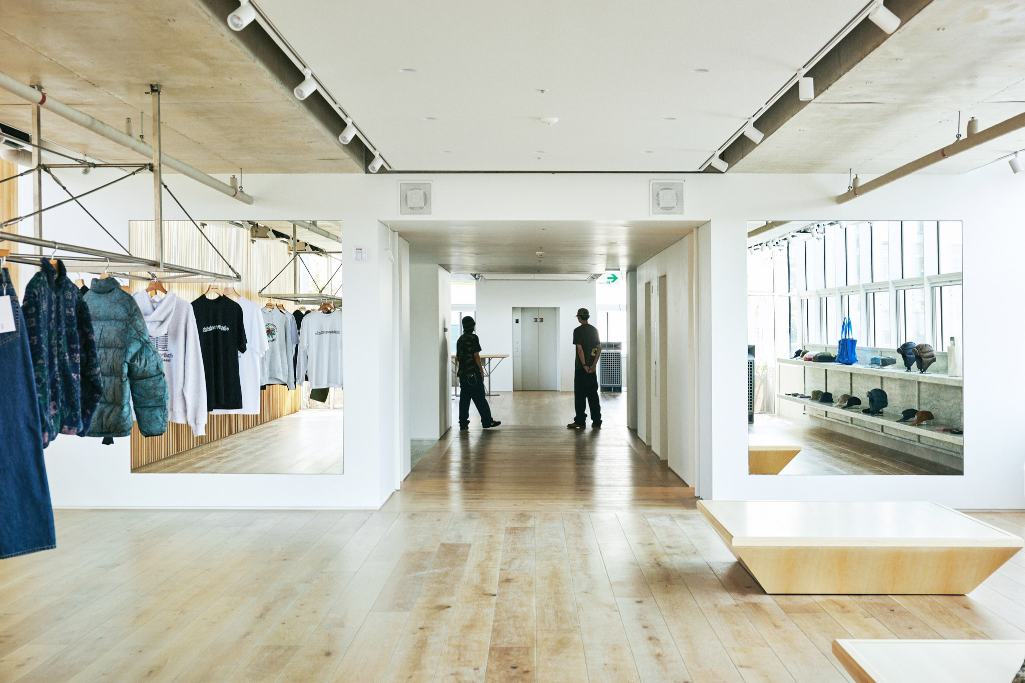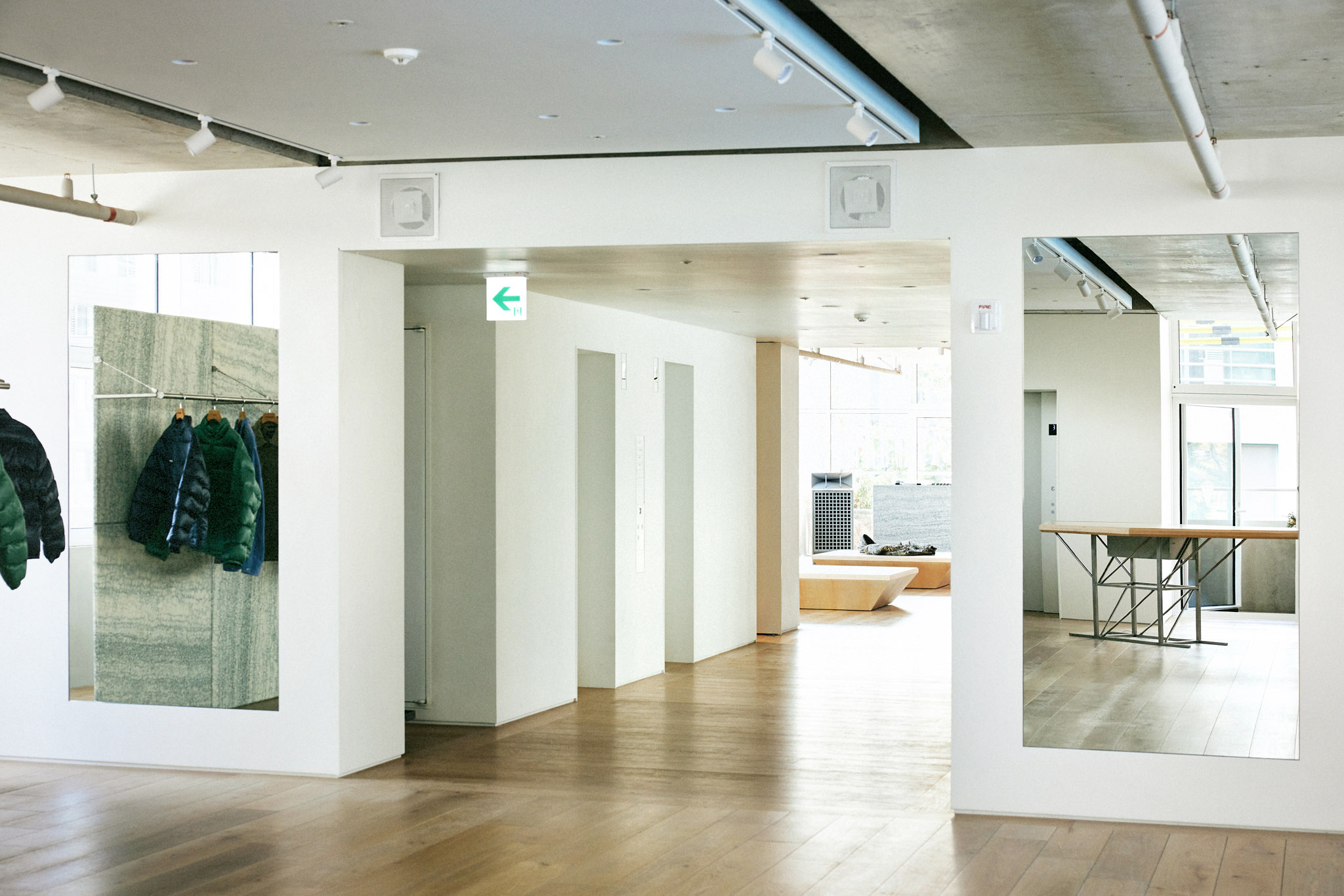 1층 로비에서 중앙 엘리베이터를 타고 올라오면 처음으로 마주하는 중앙부는 탈의실과 벤치만 두어 누구나 앉아 쉴 수 있는 여유로운 공간으로 조성했습니다. 중앙부를 기준으로 양쪽 공간이 카운터, 매대, 행거 등을 배치한 스토어입니다. 이로써 중앙부의 탈의 공간이 비좁고 복잡한 스토어의 일부로 인식되는 것이 아닌, 건물과 스토어를 연결해주는 널찍한 로비로 활용되기를 바랐습니다. 중앙부의 가구와 조명은 건물 1층 로비의 요소들을 반복 사용해 한번 마주쳤던 인상을 연장시켜 익숙한 분위기로 인식될 수 있게 했습니다.