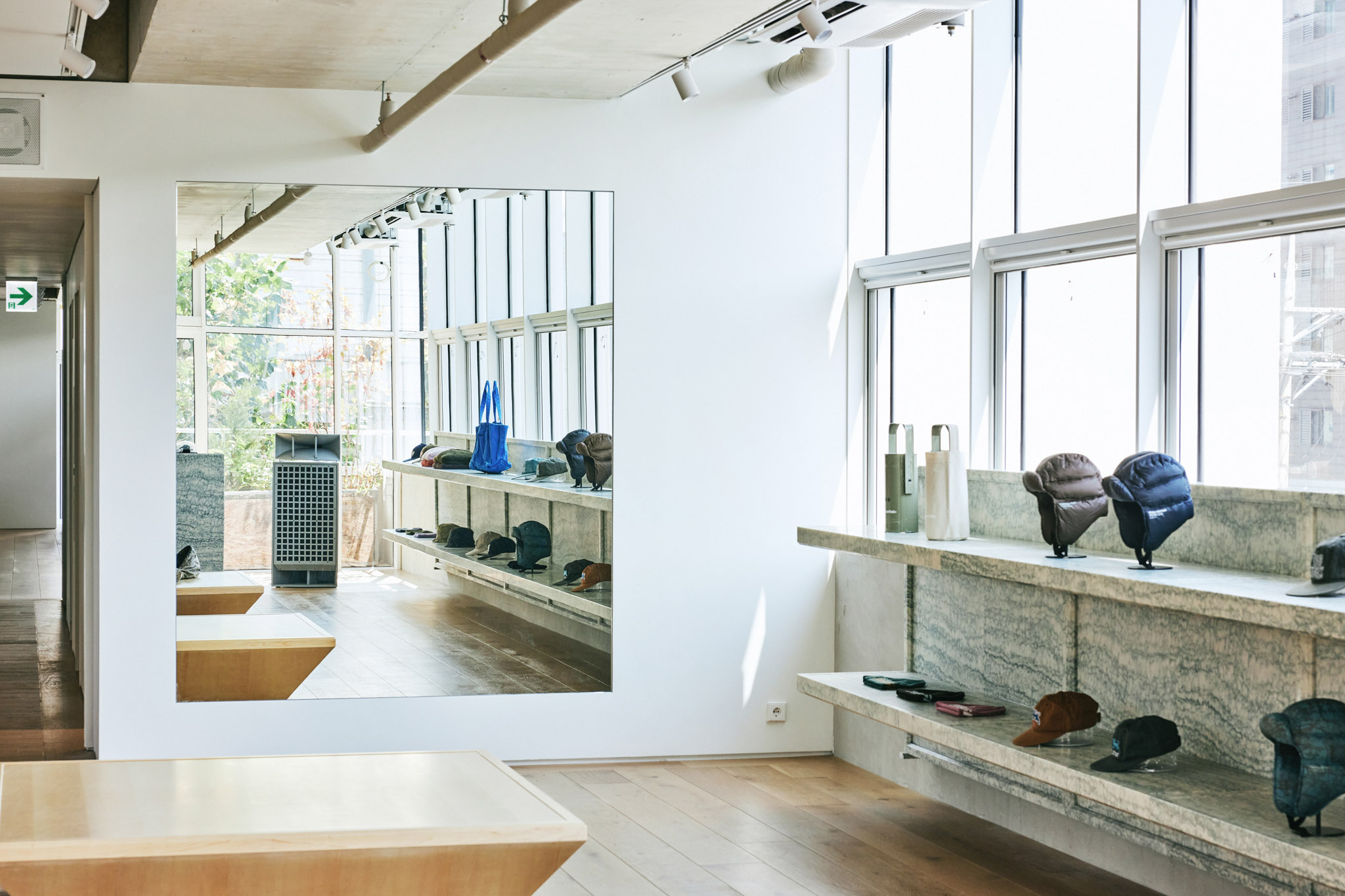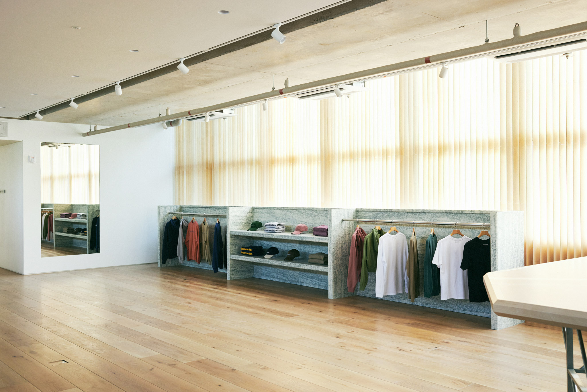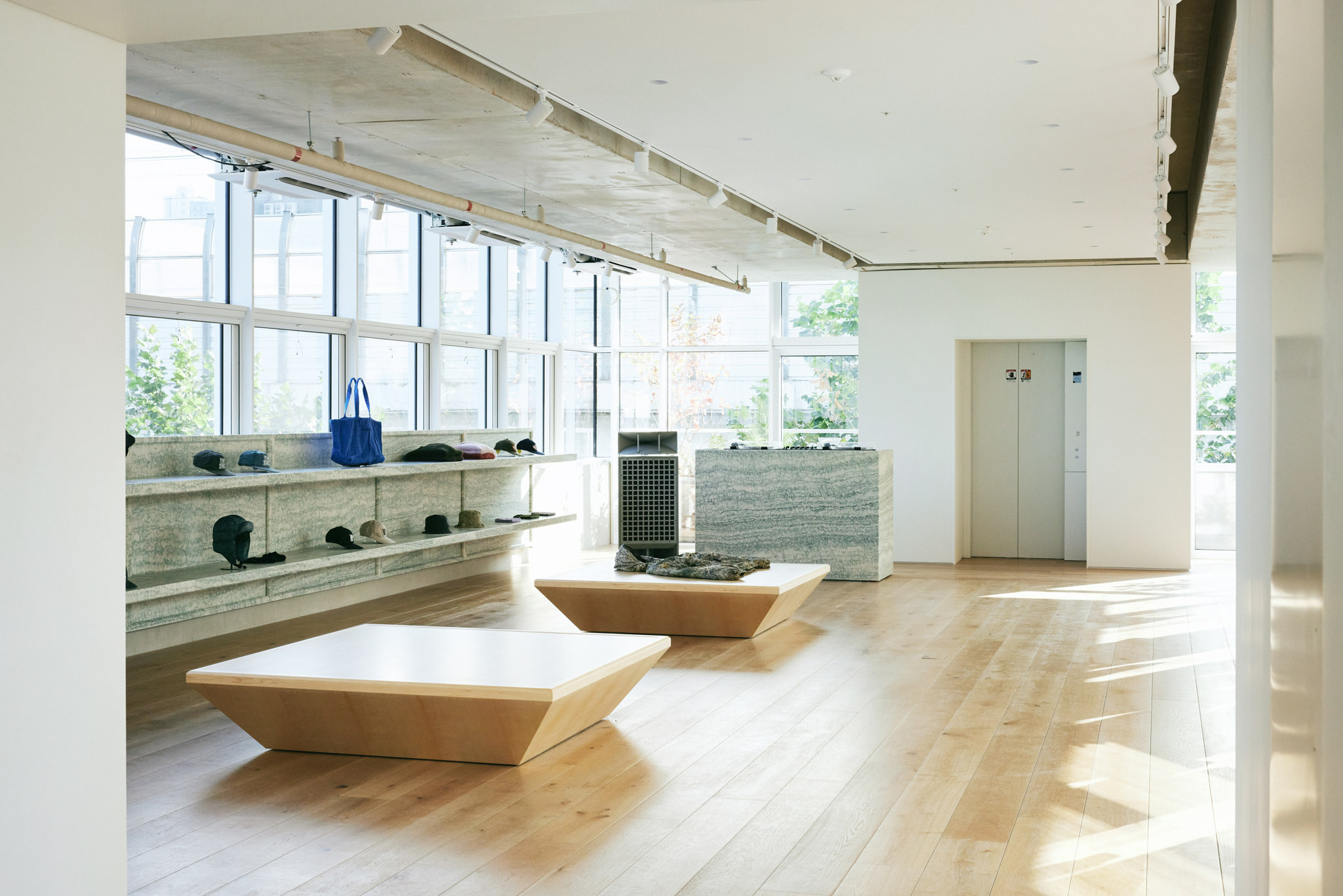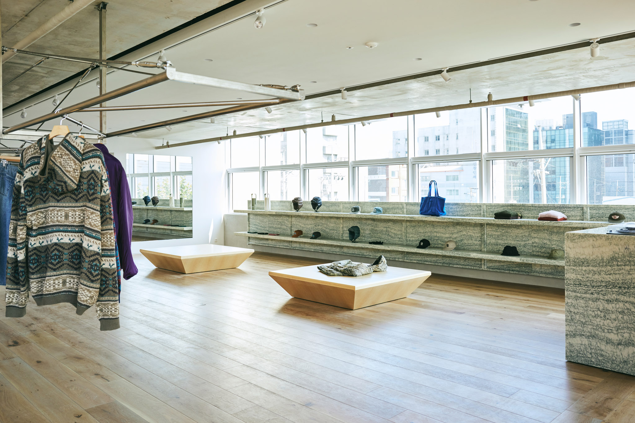 1층 로비에서 중앙 엘리베이터를 타고 올라오면 처음으로 마주하는 중앙부는 탈의실과 벤치만 두어 누구나 앉아 쉴 수 있는 여유로운 공간으로 조성했습니다. 중앙부를 기준으로 양쪽 공간이 카운터, 매대, 행거 등을 배치한 스토어입니다. 이로써 중앙부의 탈의 공간이 비좁고 복잡한 스토어의 일부로 인식되는 것이 아닌, 건물과 스토어를 연결해주는 널찍한 로비로 활용되기를 바랐습니다. 중앙부의 가구와 조명은 건물 1층 로비의 요소들을 반복 사용해 한번 마주쳤던 인상을 연장시켜 익숙한 분위기로 인식될 수 있게 했습니다.
