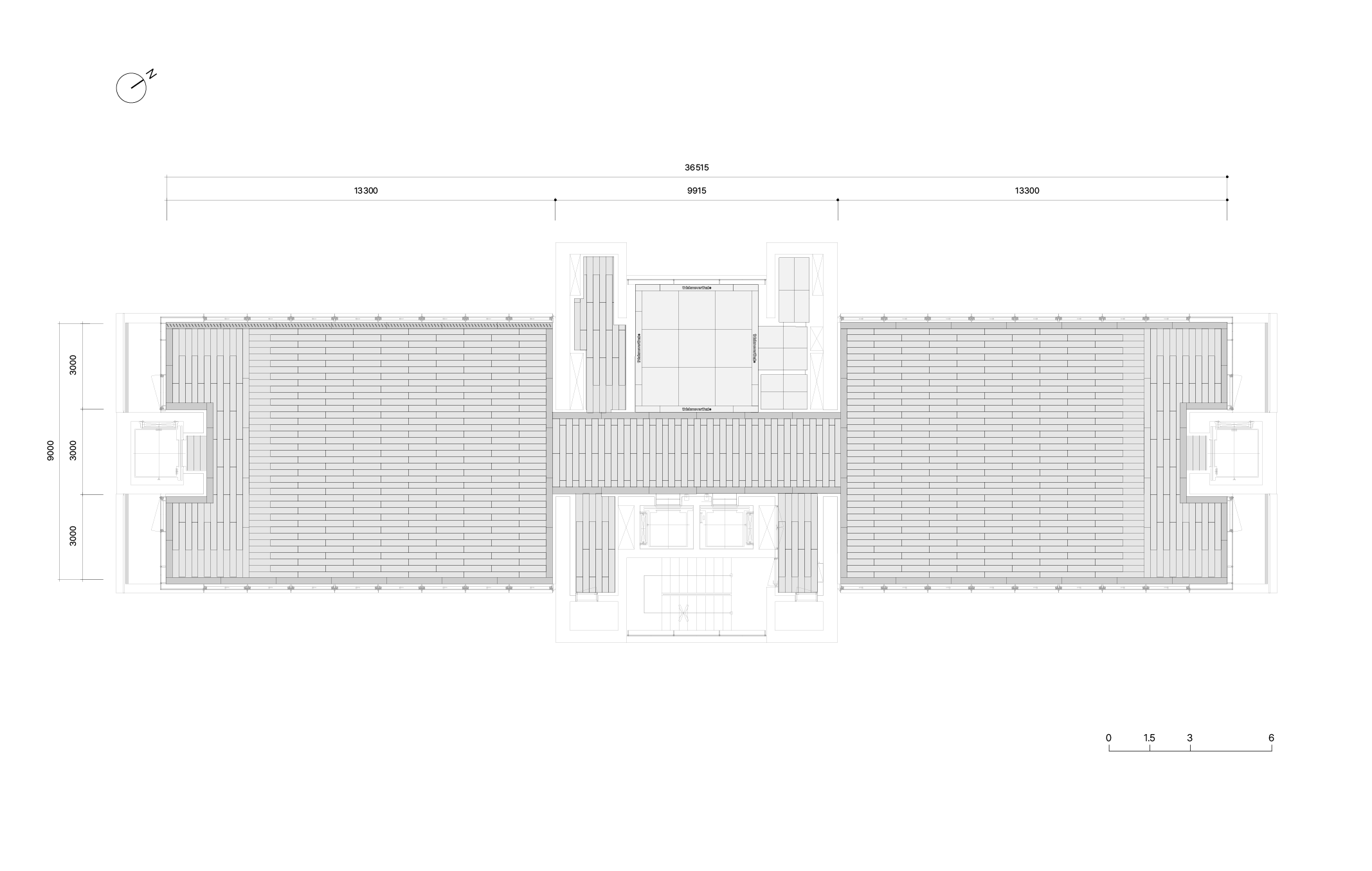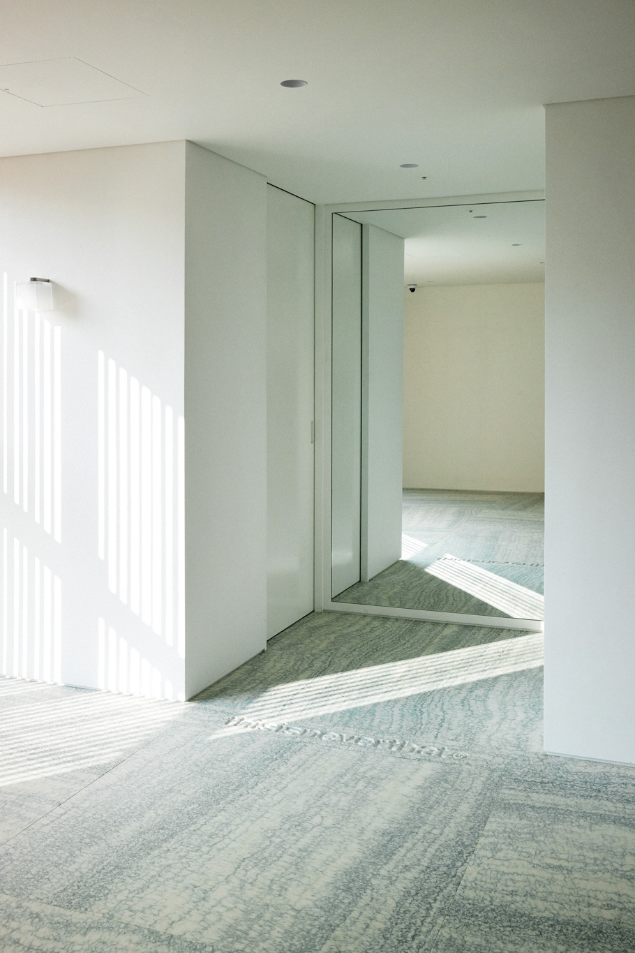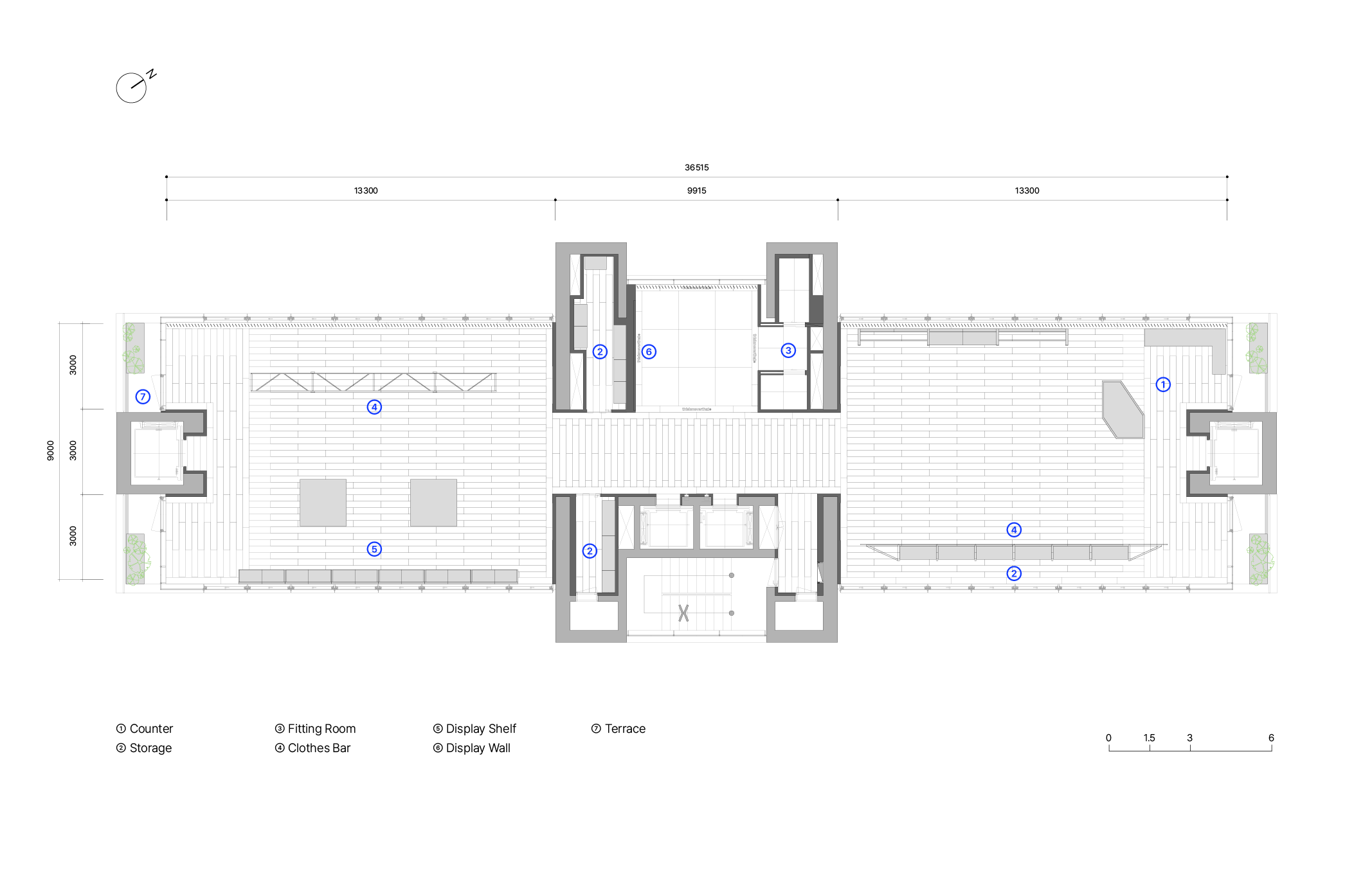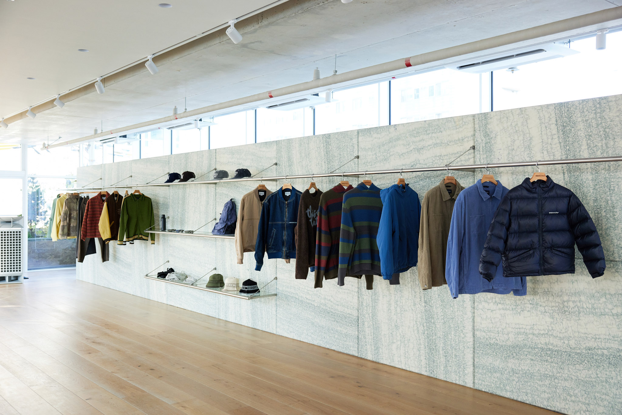 1층 로비에서 중앙 엘리베이터를 타고 올라오면 처음으로 마주하는 중앙부는 탈의실과 벤치만 두어 누구나 앉아 쉴 수 있는 여유로운 공간으로 조성했습니다. 중앙부를 기준으로 양쪽 공간이 카운터, 매대, 행거 등을 배치한 스토어입니다. 이로써 중앙부의 탈의 공간이 비좁고 복잡한 스토어의 일부로 인식되는 것이 아닌, 건물과 스토어를 연결해주는 널찍한 로비로 활용되기를 바랐습니다. 중앙부의 가구와 조명은 건물 1층 로비의 요소들을 반복 사용해 한번 마주쳤던 인상을 연장시켜 익숙한 분위기로 인식될 수 있게 했습니다.
