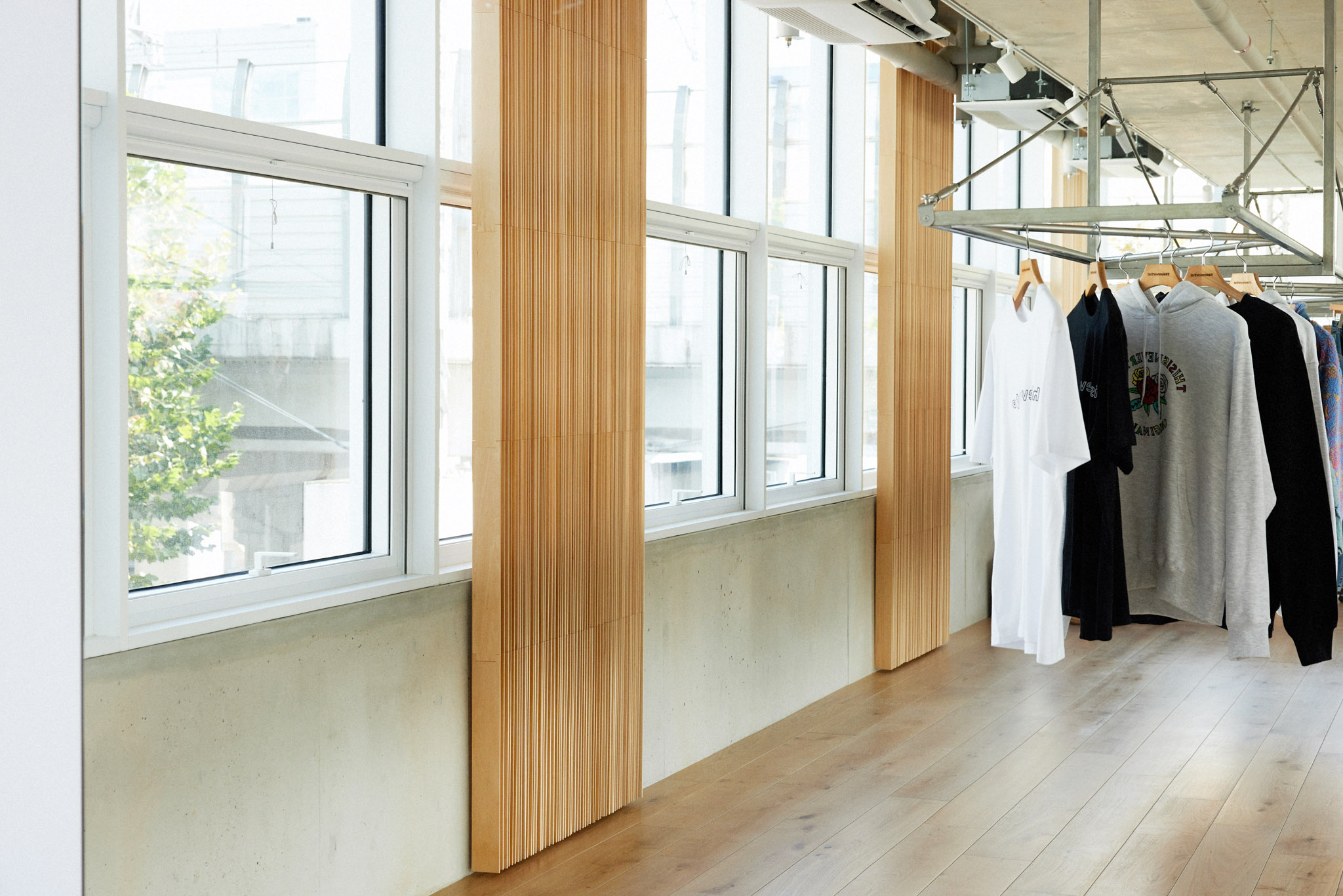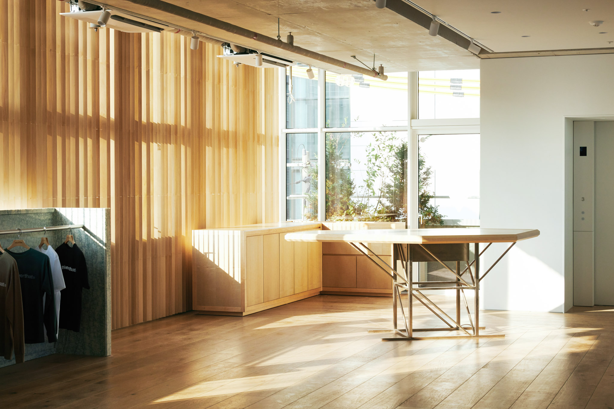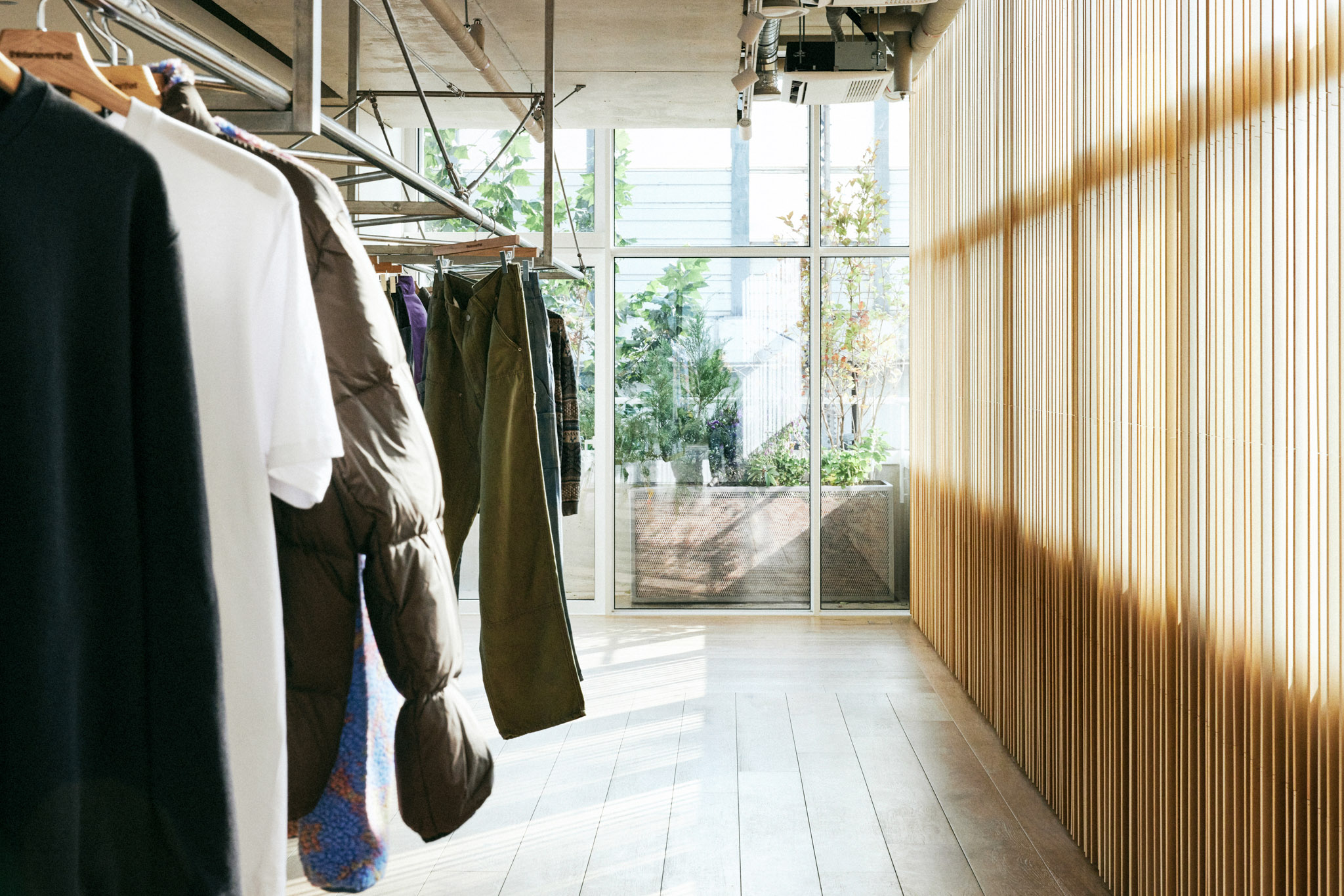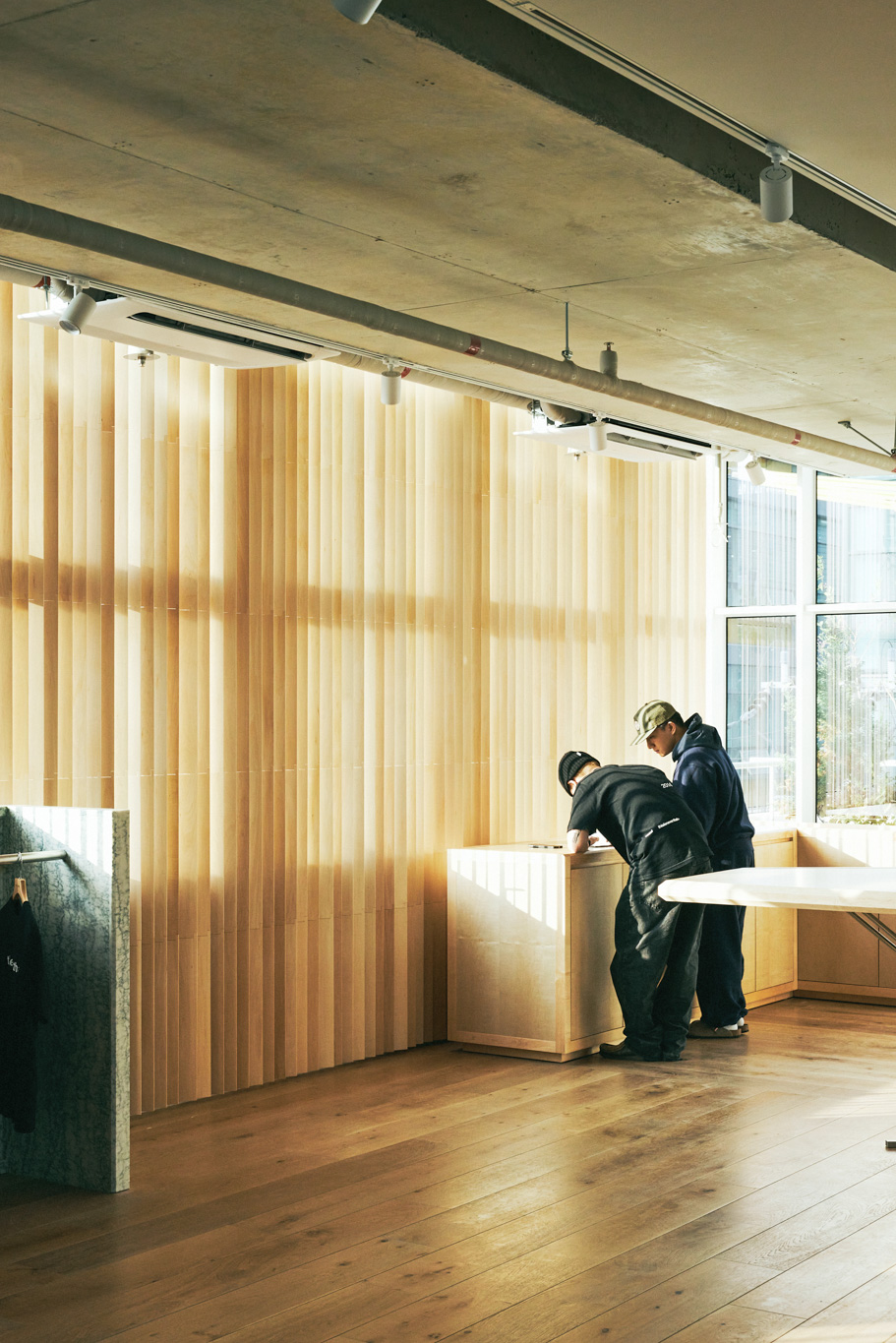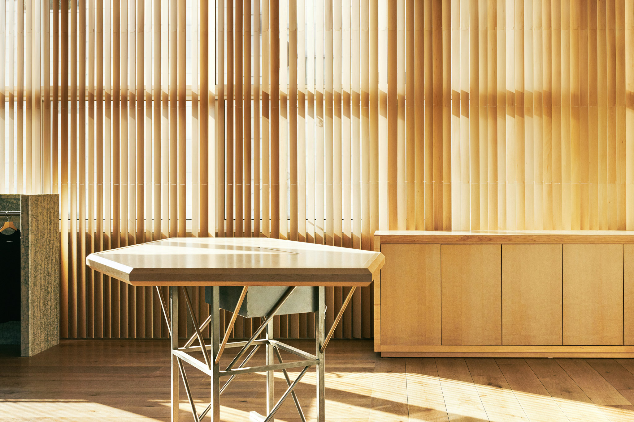이 건물은 모든 면이 창호로 되어 있고 벽체가 없는 것이 특징입니다. 그렇다 보니 해가 떠 있는 대부분의 시간에 해가 들어오는데, 특히 오후 시간대 서쪽에서 스토어 내부로 아주 깊이 스미는 강한 햇살은 쇼핑을 방해하는 요소일 수 있었습니다. 이에 대한 방안으로 설치한 목재 버티컬 블라인드는 필요한 만큼만 빛을 들이면서도 공간에 따뜻한 인상을 만들어 냅니다.