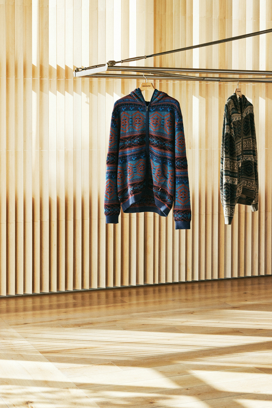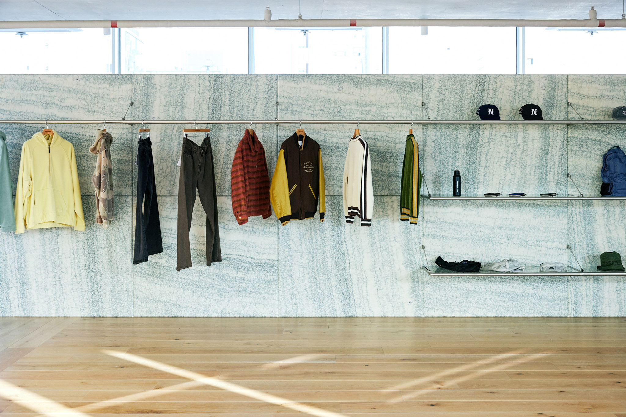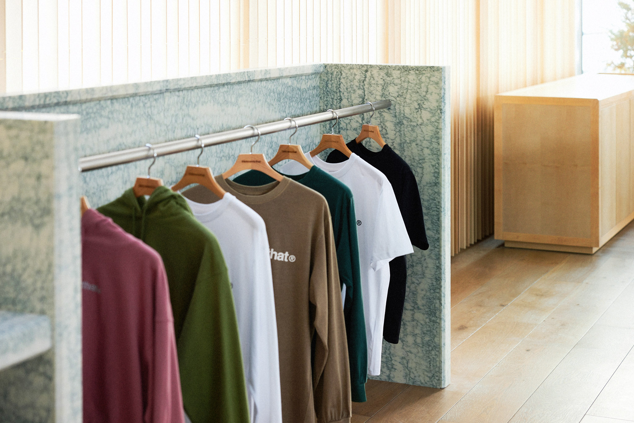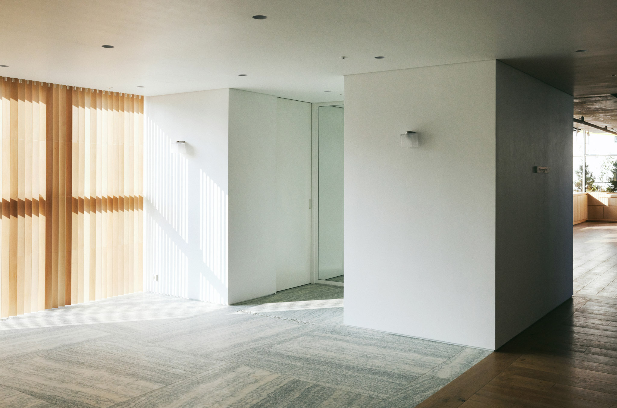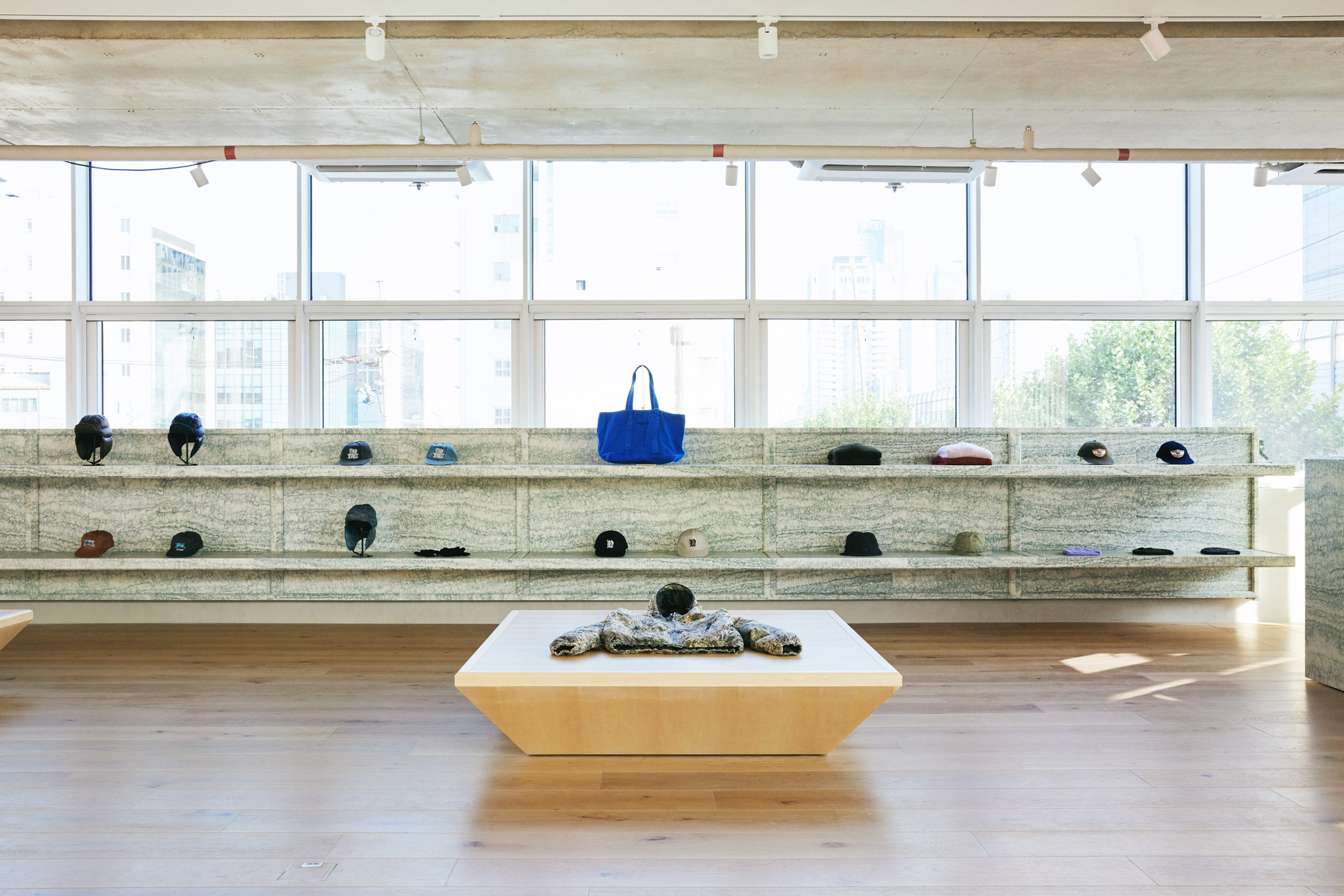 이 건물은 모든 면이 창호로 되어 있고 벽체가 없는 것이 특징입니다. 그렇다 보니 해가 떠 있는 대부분의 시간에 해가 들어오는데, 특히 오후 시간대 서쪽에서 스토어 내부로 아주 깊이 스미는 강한 햇살은 쇼핑을 방해하는 요소일 수 있었습니다. 이에 대한 방안으로 설치한 목재 버티컬 블라인드는 필요한 만큼만 빛을 들이면서도 공간에 따뜻한 인상을 만들어 냅니다.
