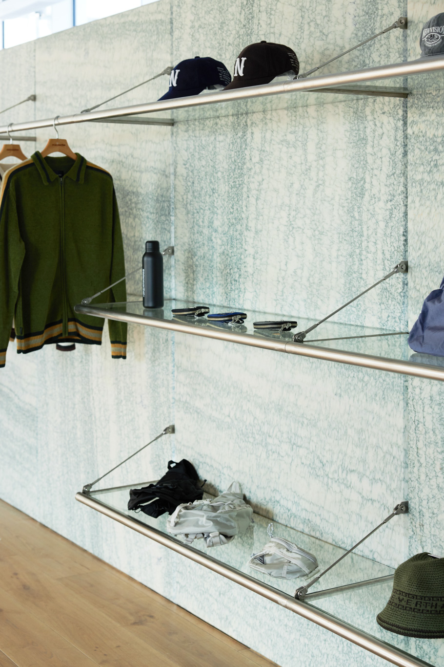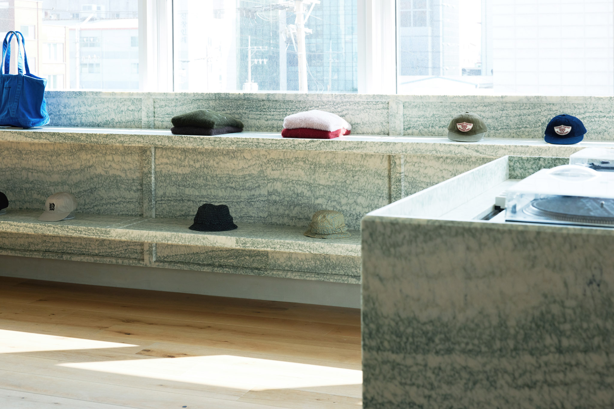 집기와 집기, 벽체와 벽체 사이에 충분한 동선을 확보하여 공간이 쾌적하면서도 여유롭게 느껴지도록 구성했습니다. 각각의 집기는 그 형태와 크기가 단순하고 시원시원하지만, 꼭 필요한 기능적인 부분에 세장하고 섬세한 디테일을 적용해 완성도를 높였습니다. 또한, 창밖 풍경에 방해되지 않도록 창호 라인에 맞춰 집기의 높이를 낮추고, 금속 구조물은 필요한 만큼 얇고 간결하게 제작되었습니다. 대리석 벽은 일부 어수선한 배경을 가리는 동시에 매장내 재고를 보관하는 창고의 기능을 하고 있습니다.
