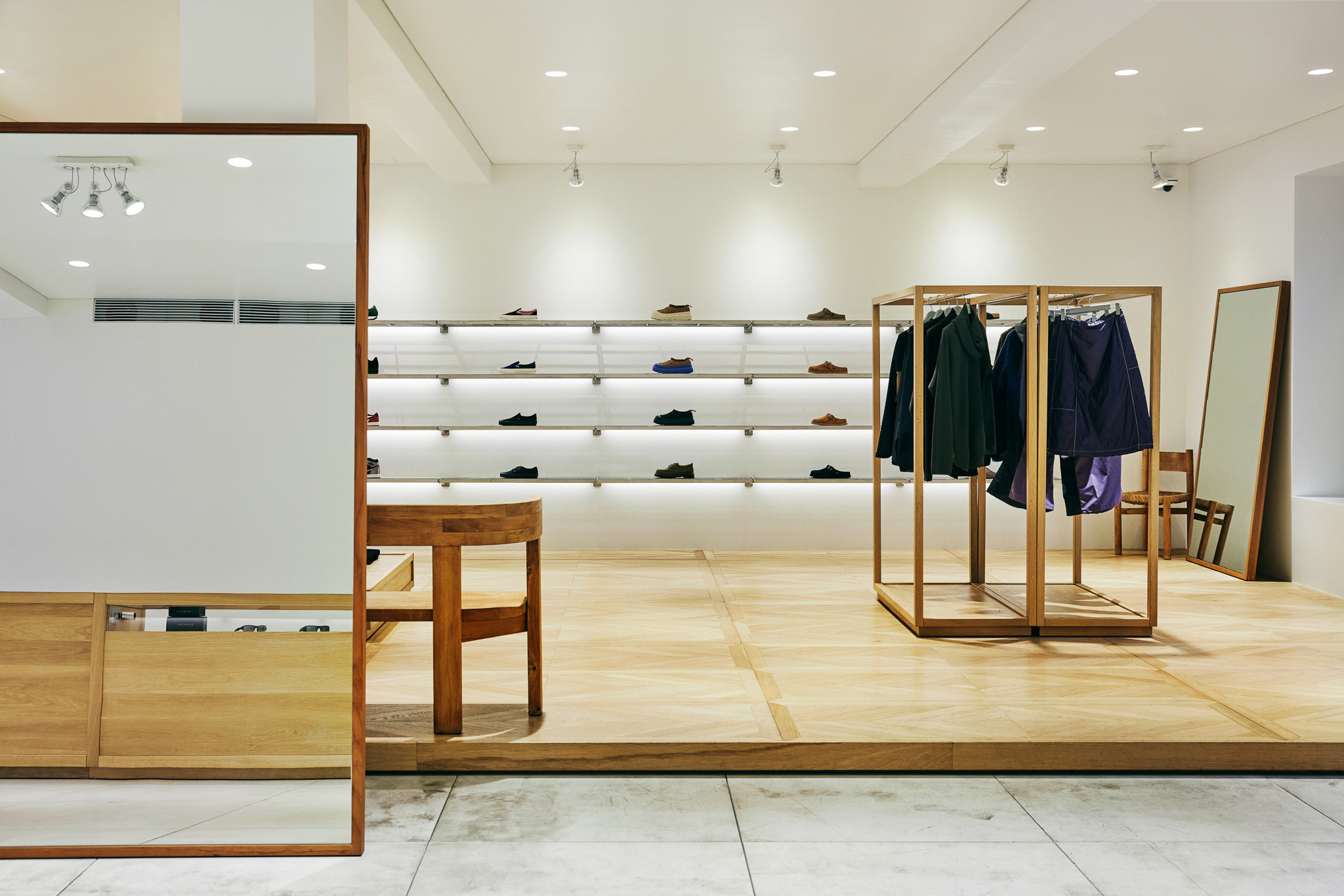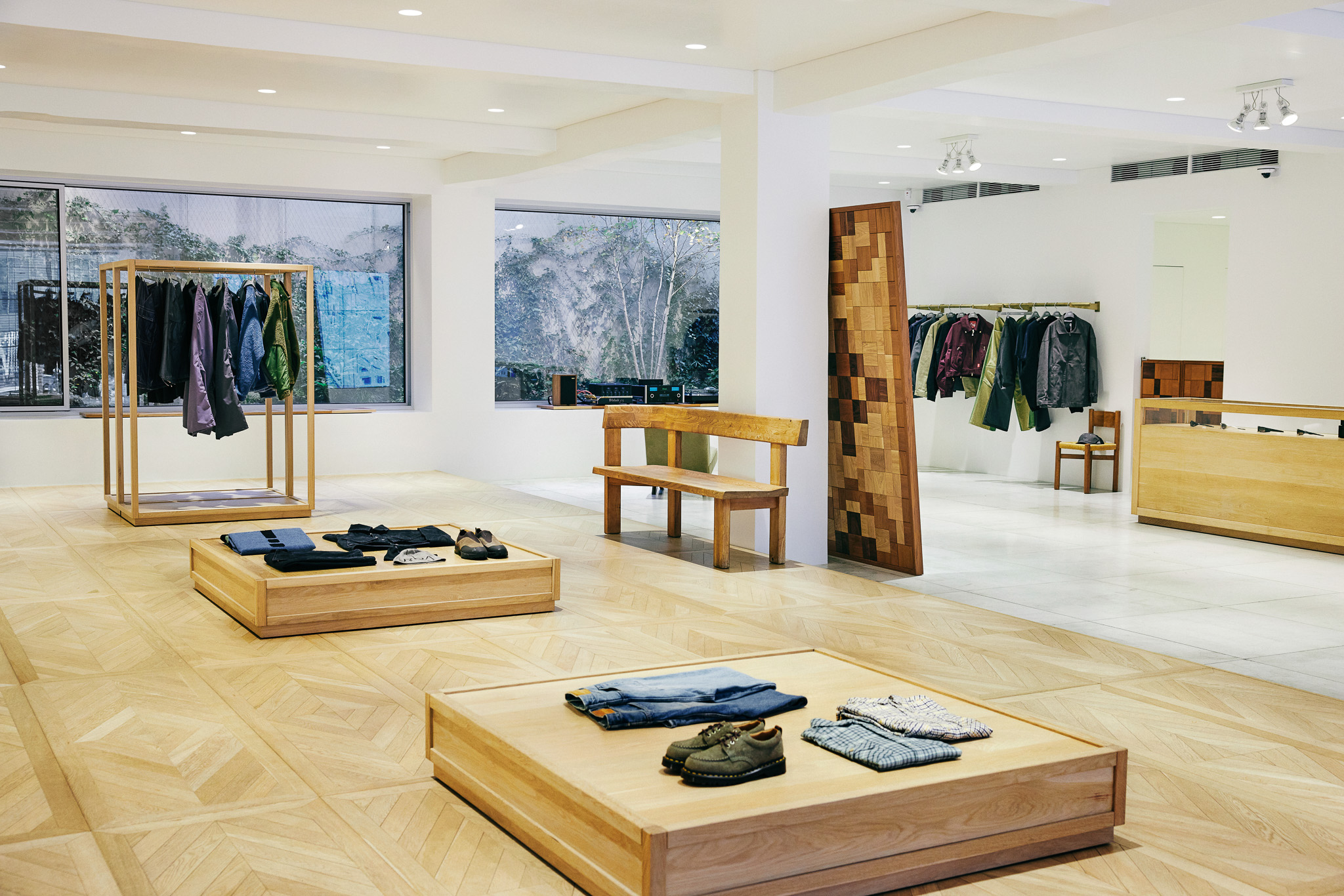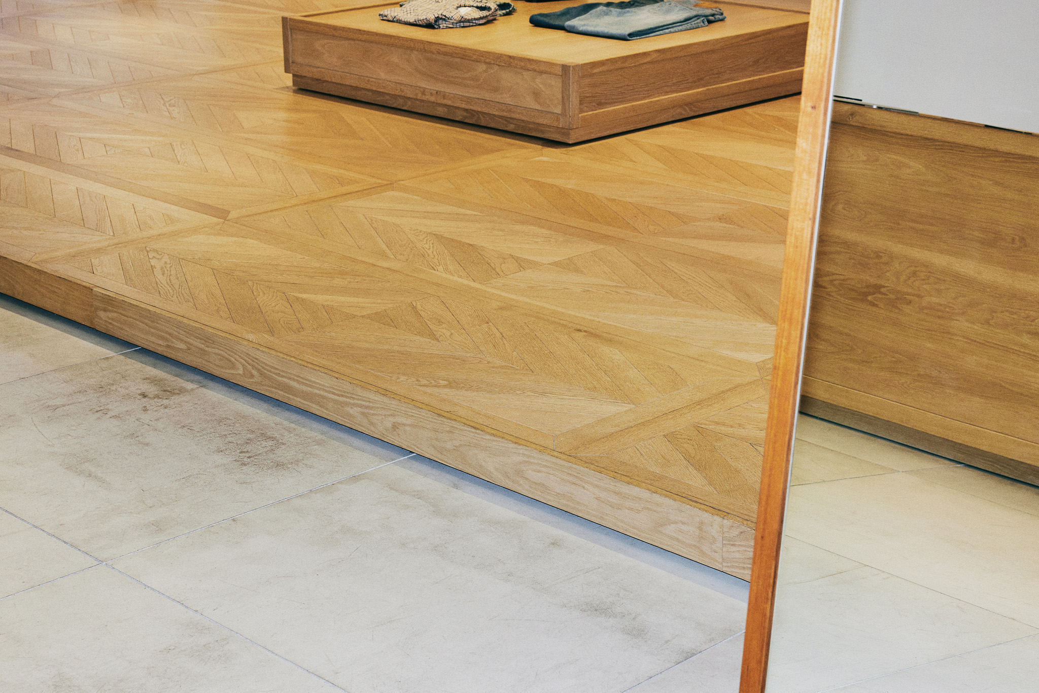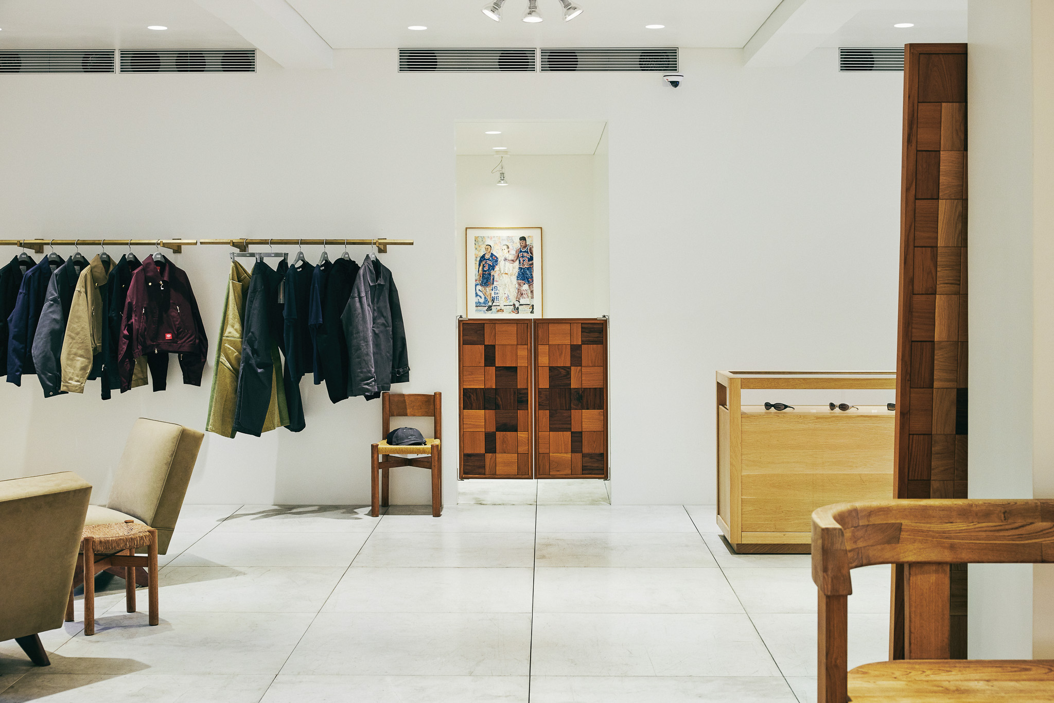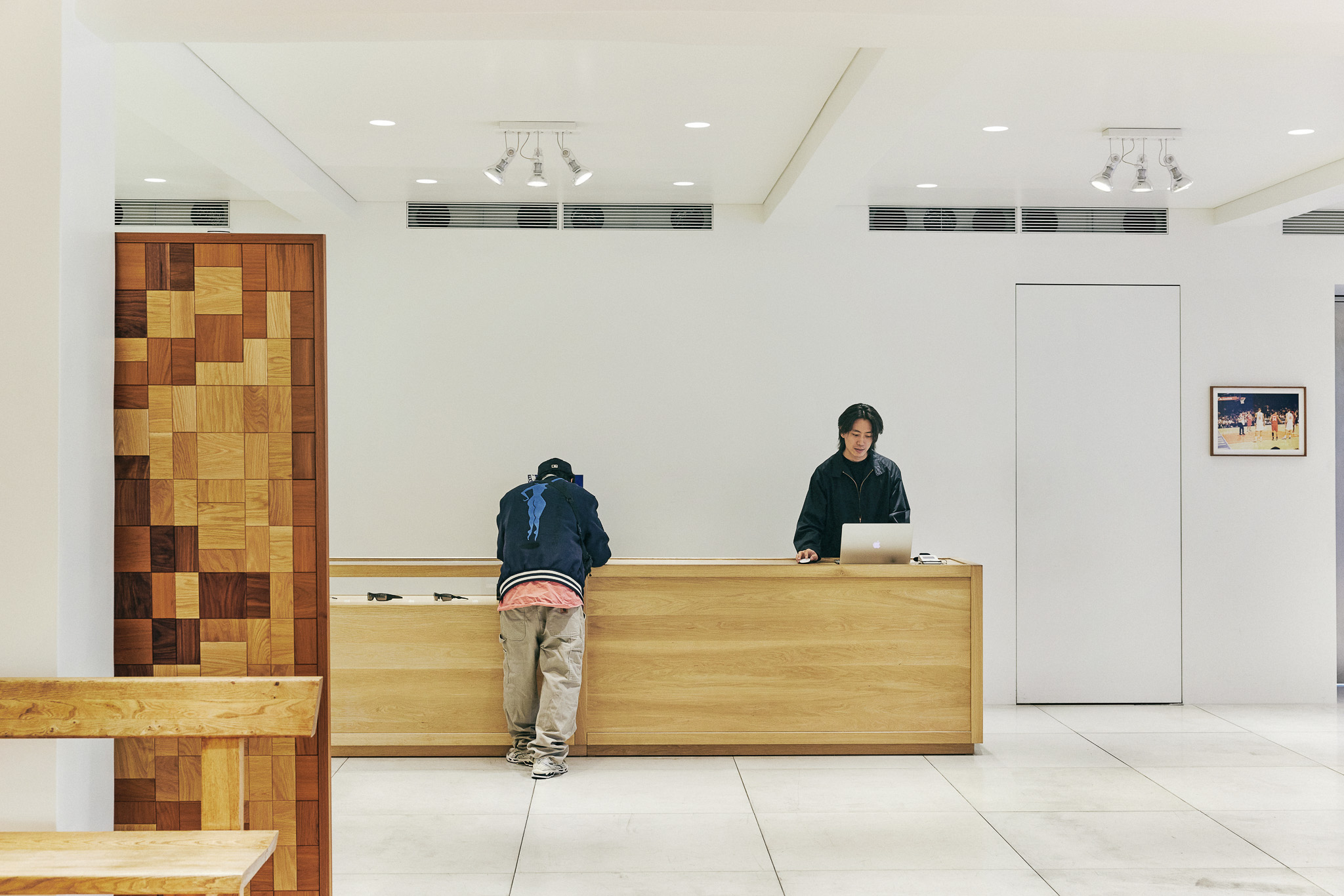 목재 집기에도 공예적인 측면을 부각했습니다. 매대, 옷걸이 등 가구는 짜맞춤 구조와 모따기 가공 등을 활용해 제작했습니다. 스윙도어, 문고리, 거울 등에는 색이 다른 세 가지 종류의 나무를 사용해 모자이크 패턴을 넣었습니다. 오너의 취향을 반영한 농구공이나 코트를 형상화한 무늬죠.