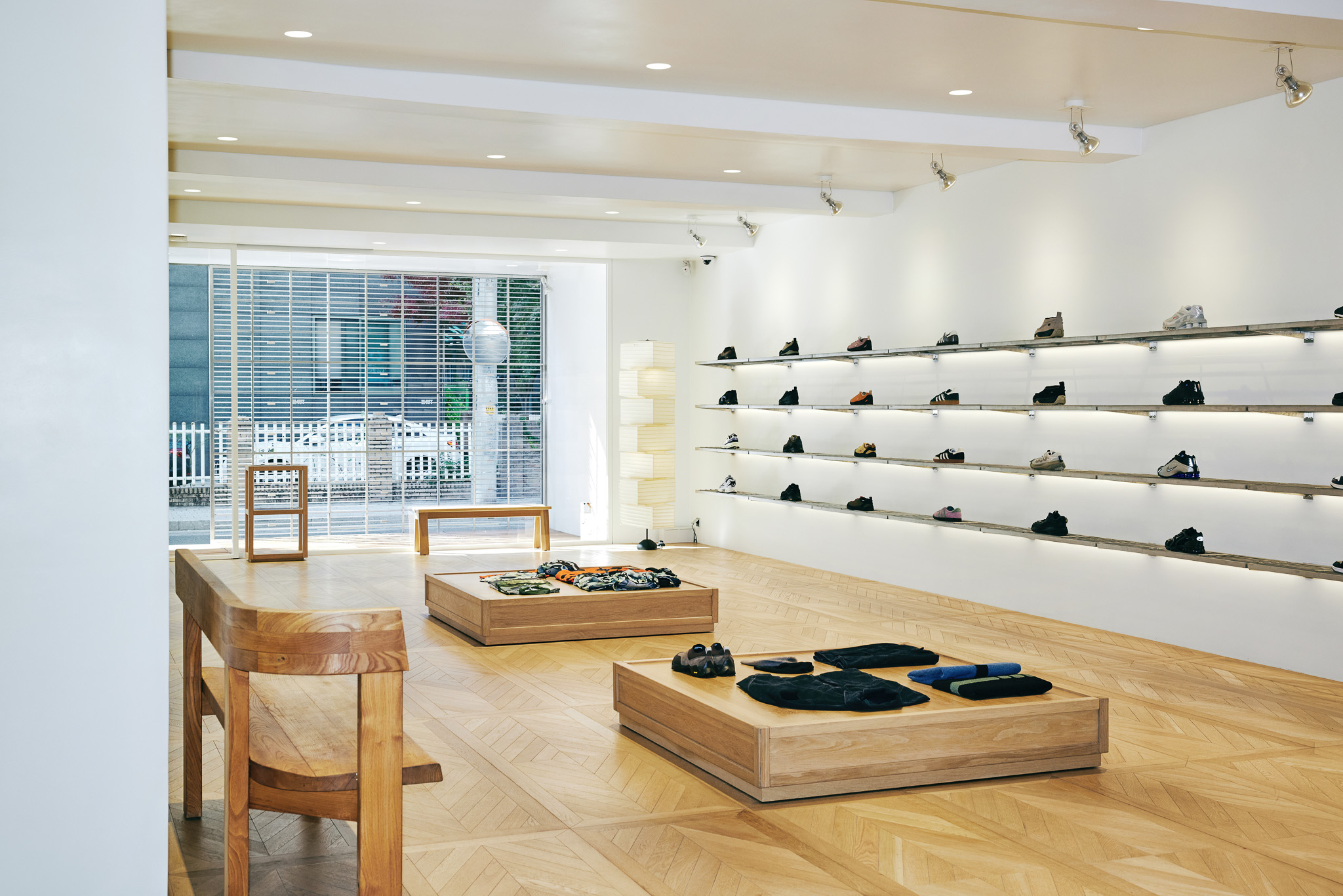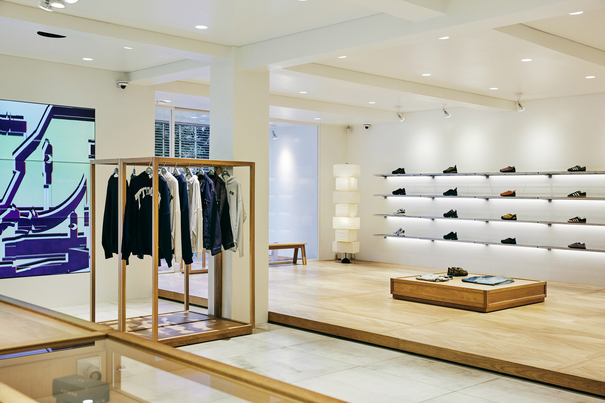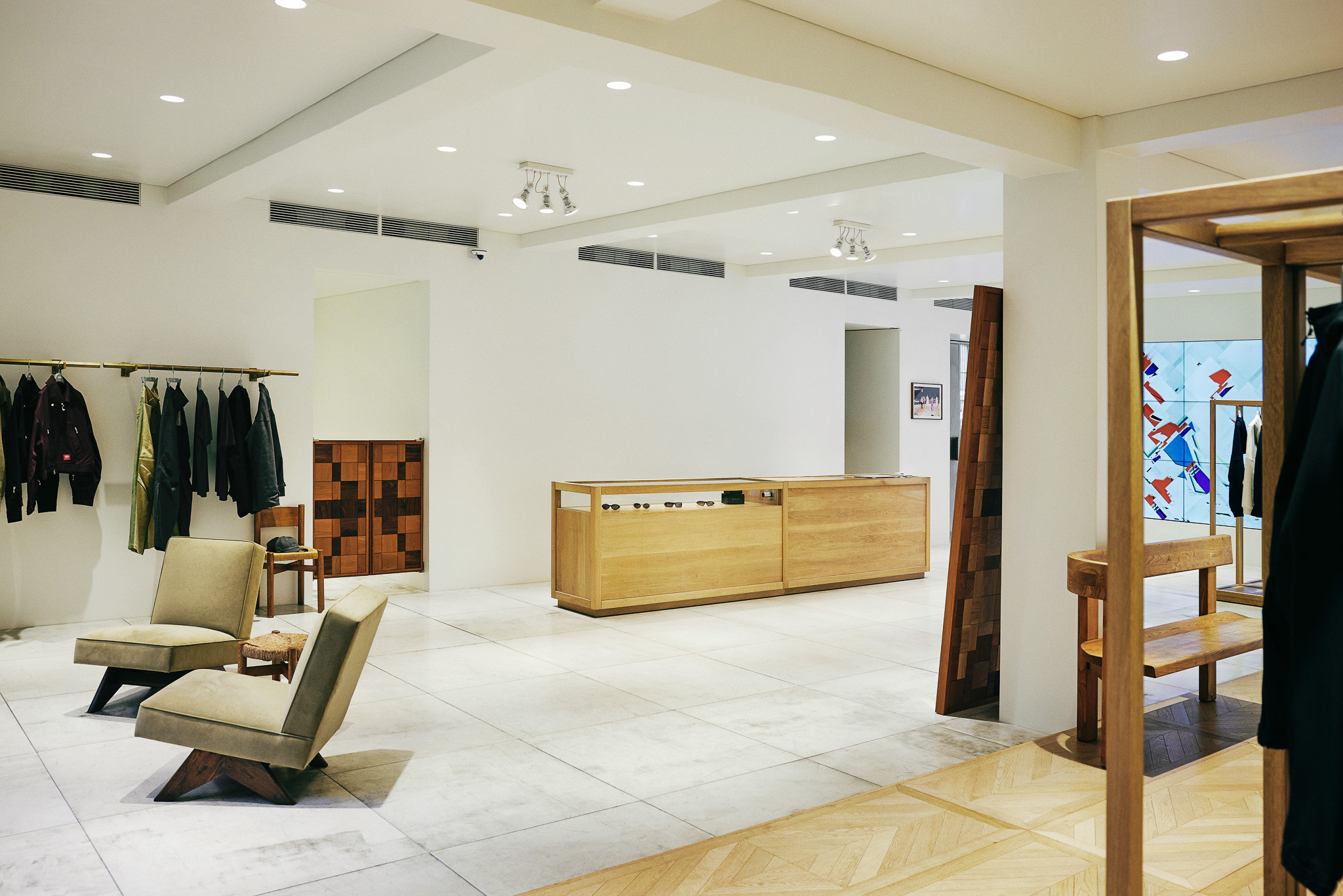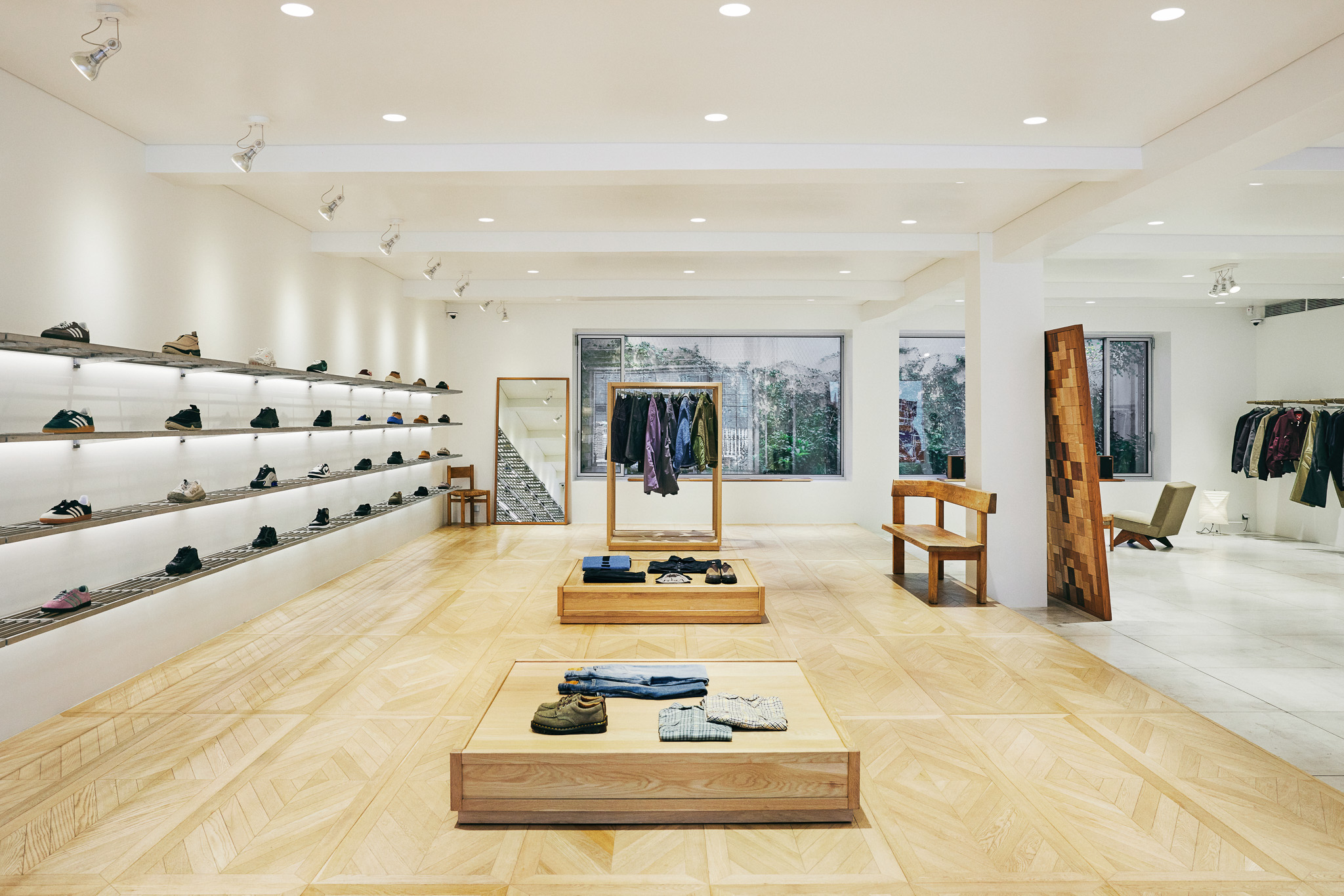 목재 집기에도 공예적인 측면을 부각했습니다. 매대, 옷걸이 등 가구는 짜맞춤 구조와 모따기 가공 등을 활용해 제작했습니다. 스윙도어, 문고리, 거울 등에는 색이 다른 세 가지 종류의 나무를 사용해 모자이크 패턴을 넣었습니다. 오너의 취향을 반영한 농구공이나 코트를 형상화한 무늬죠.
