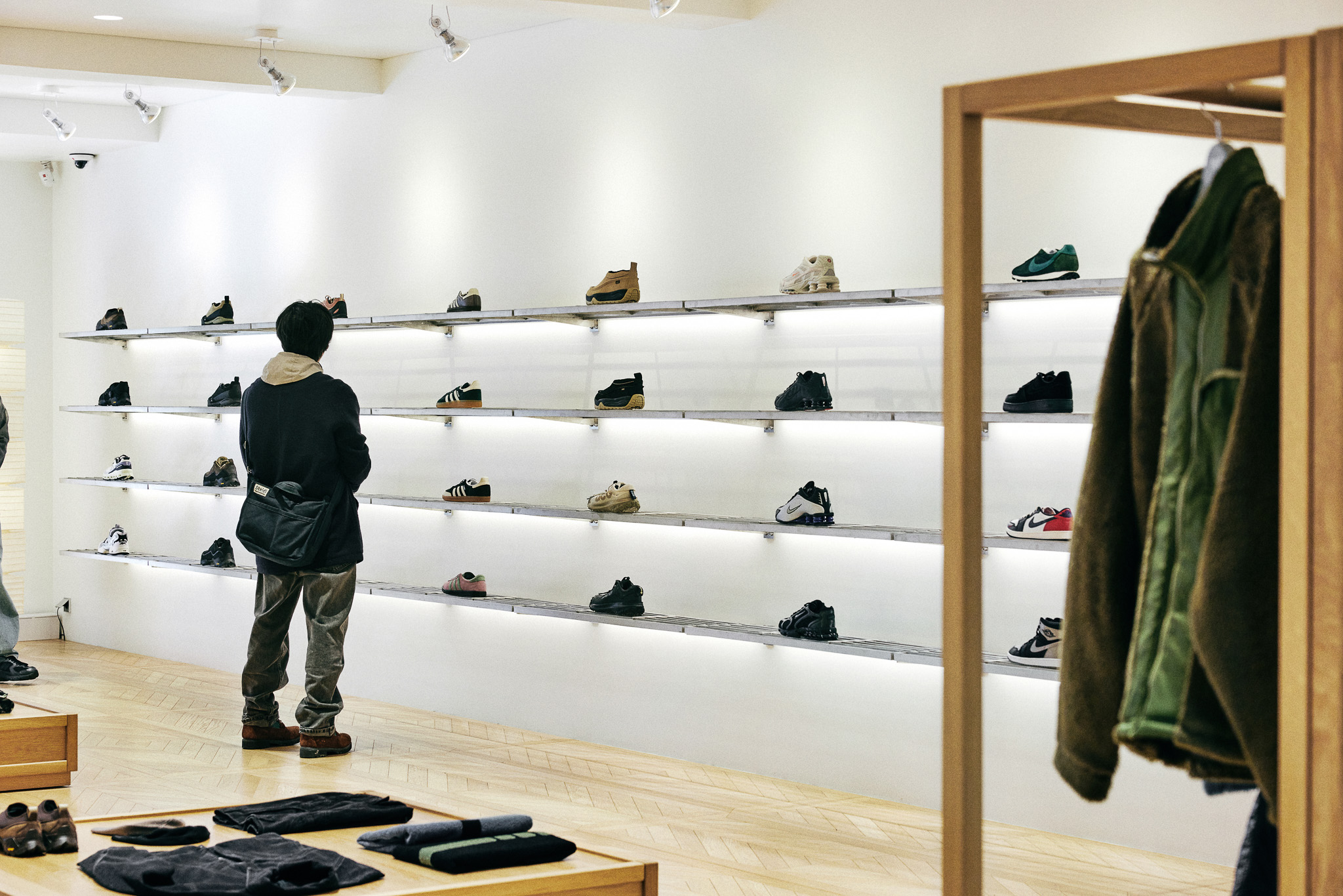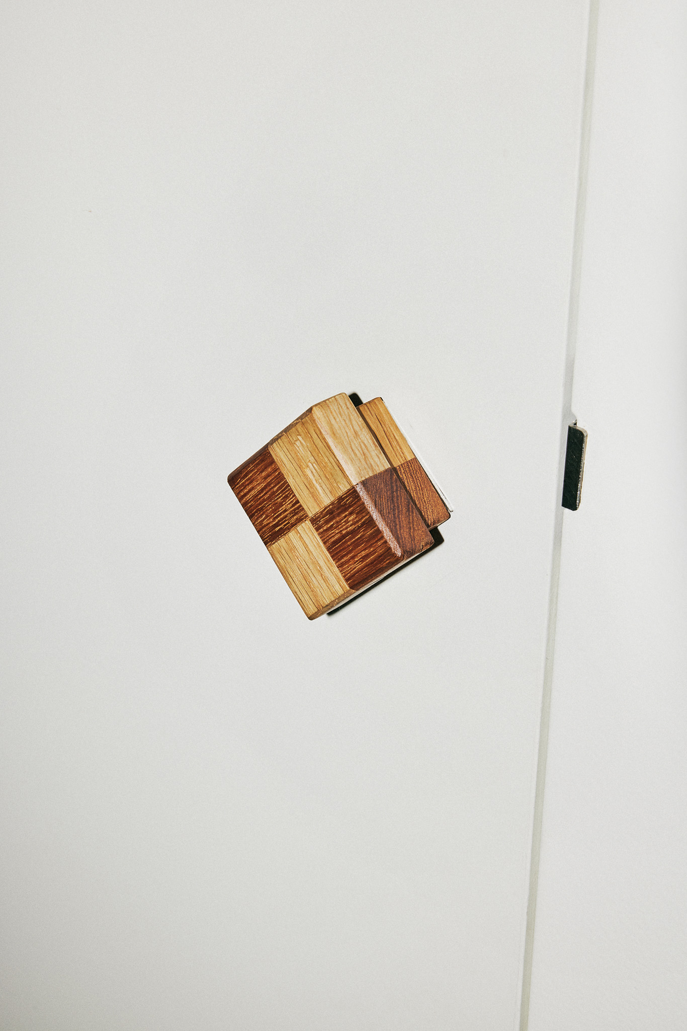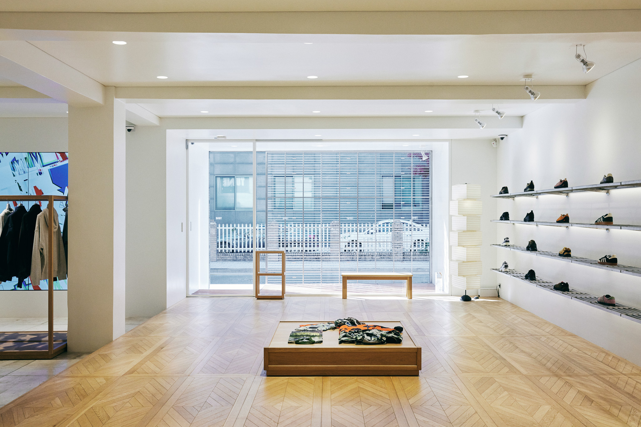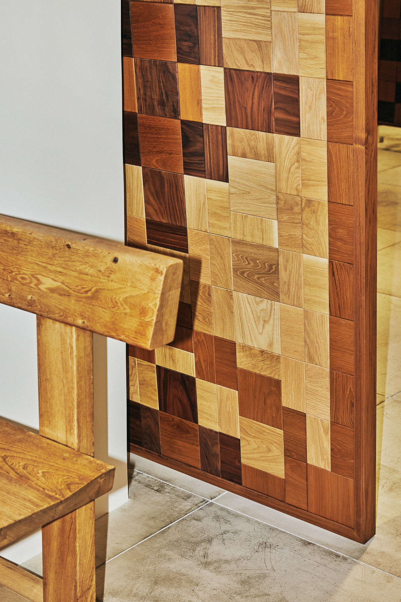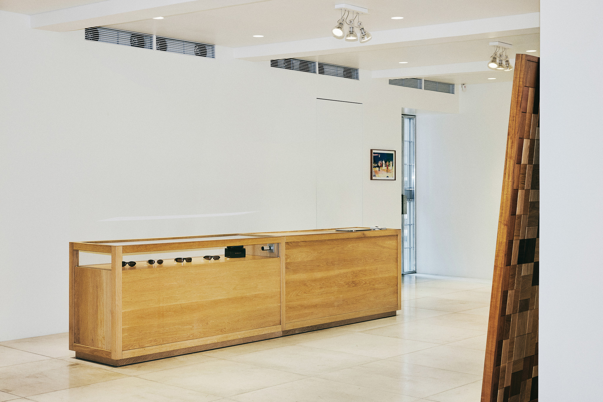 목재 집기에도 공예적인 측면을 부각했습니다. 매대, 옷걸이 등 가구는 짜맞춤 구조와 모따기 가공 등을 활용해 제작했습니다. 스윙도어, 문고리, 거울 등에는 색이 다른 세 가지 종류의 나무를 사용해 모자이크 패턴을 넣었습니다. 오너의 취향을 반영한 농구공이나 코트를 형상화한 무늬죠.