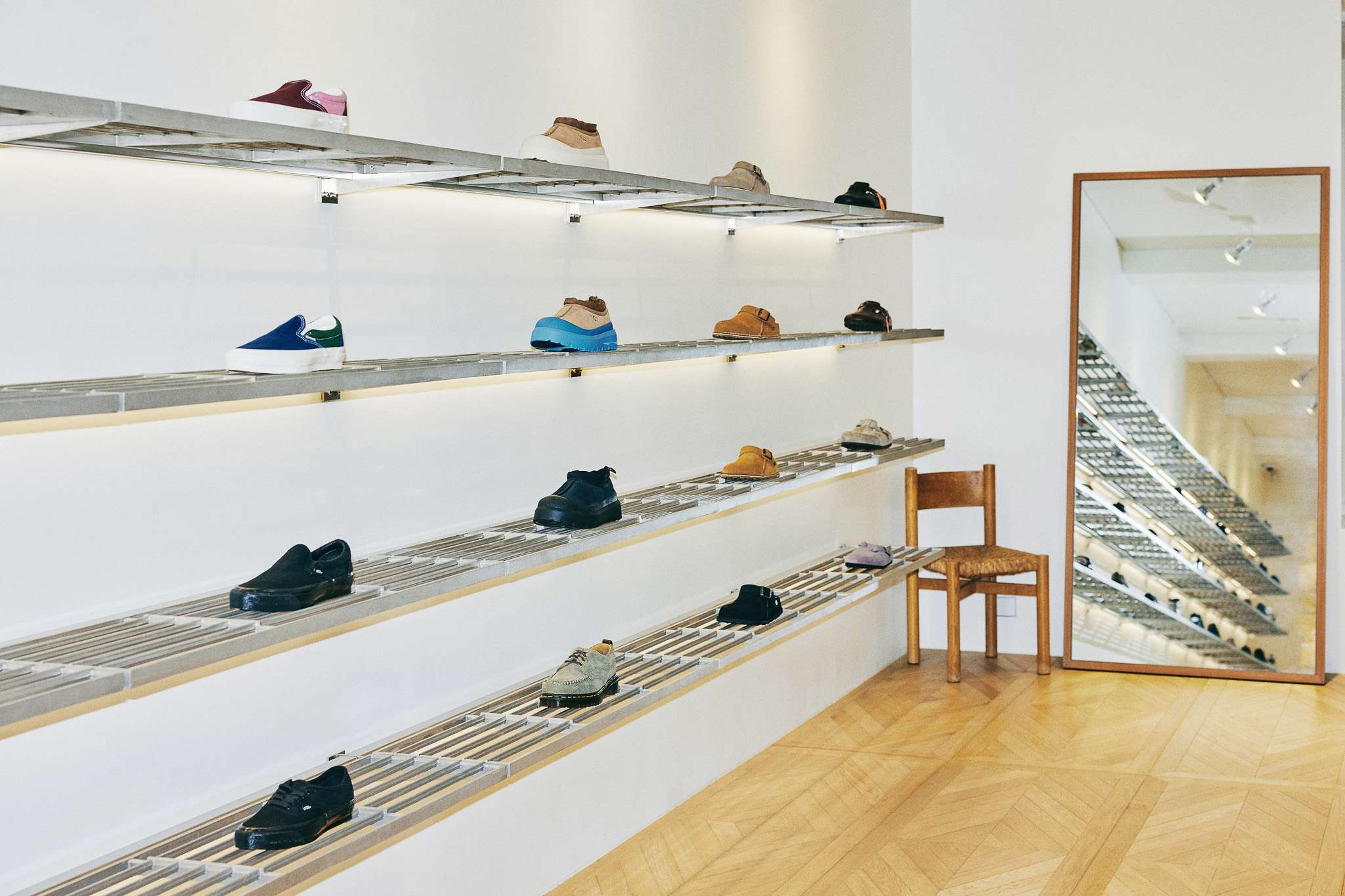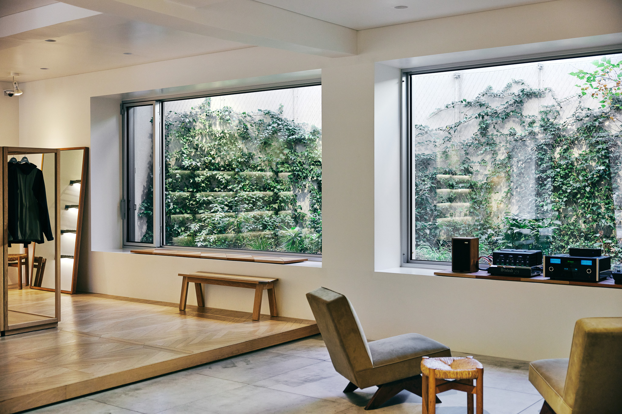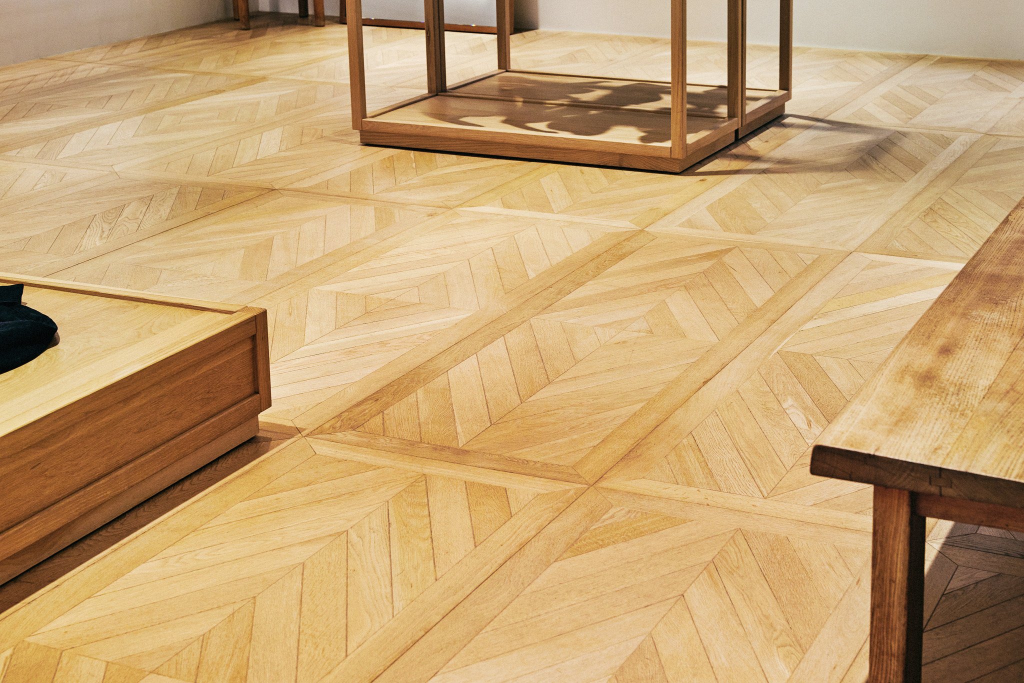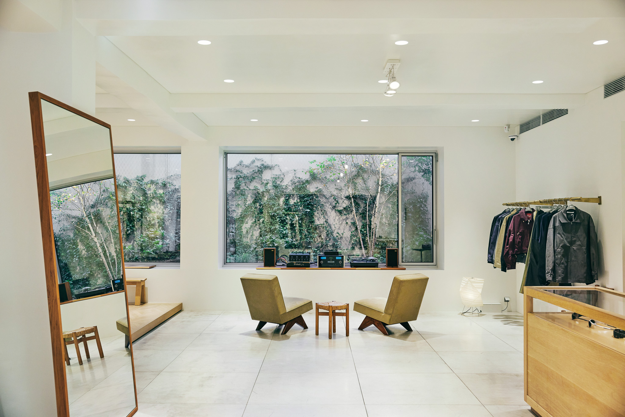 목재 집기에도 공예적인 측면을 부각했습니다. 매대, 옷걸이 등 가구는 짜맞춤 구조와 모따기 가공 등을 활용해 제작했습니다. 스윙도어, 문고리, 거울 등에는 색이 다른 세 가지 종류의 나무를 사용해 모자이크 패턴을 넣었습니다. 오너의 취향을 반영한 농구공이나 코트를 형상화한 무늬죠.