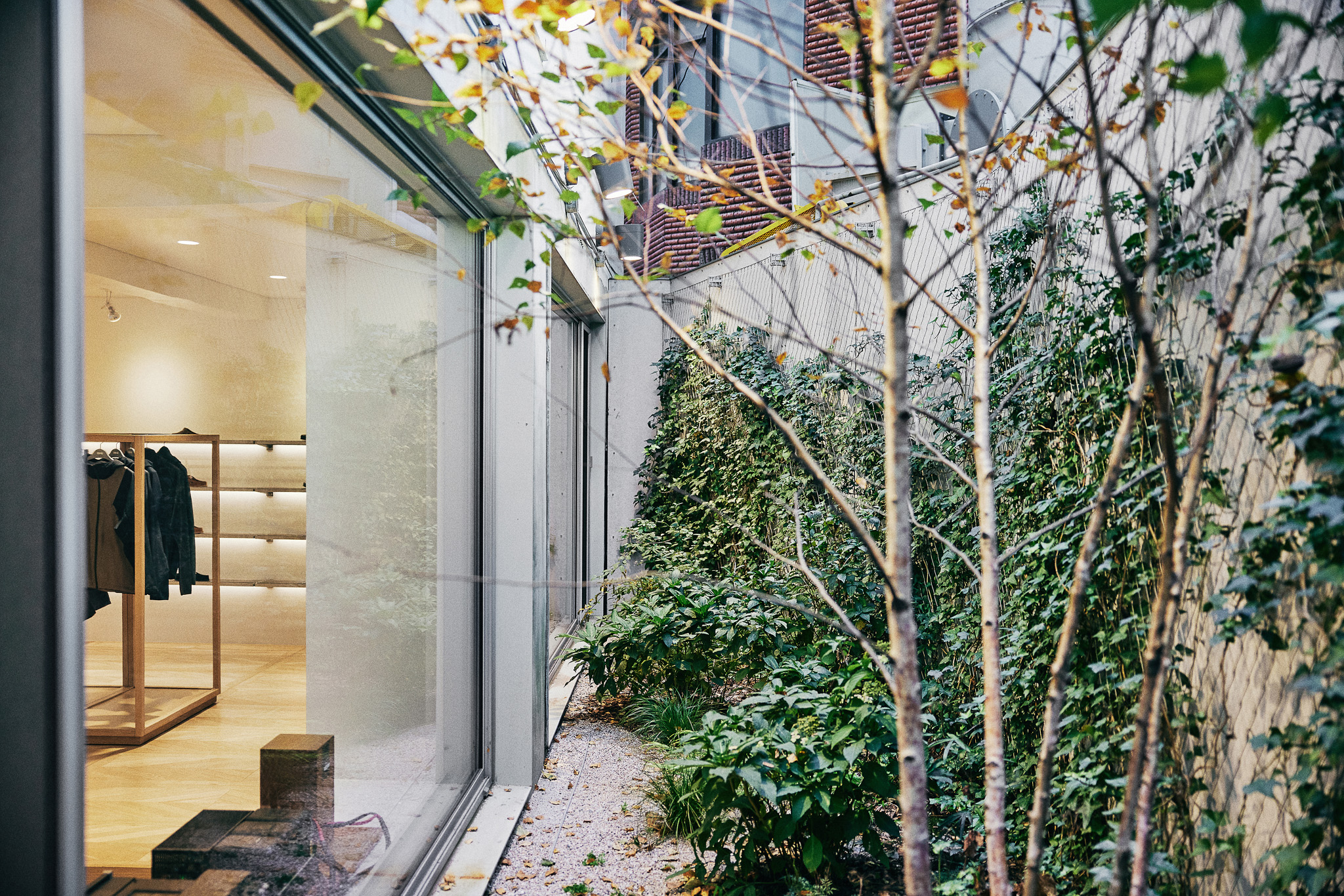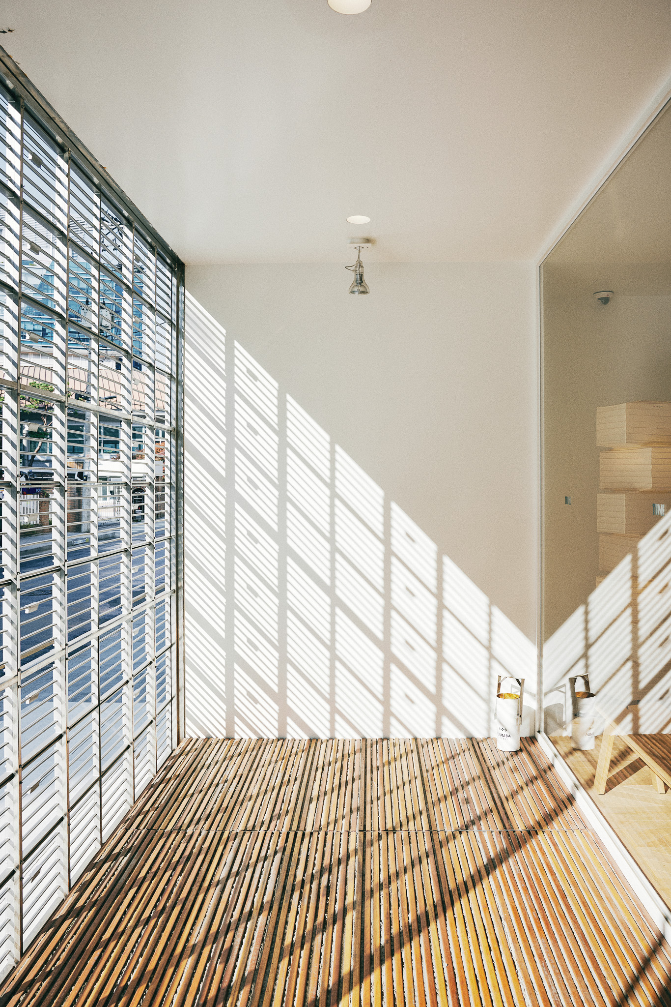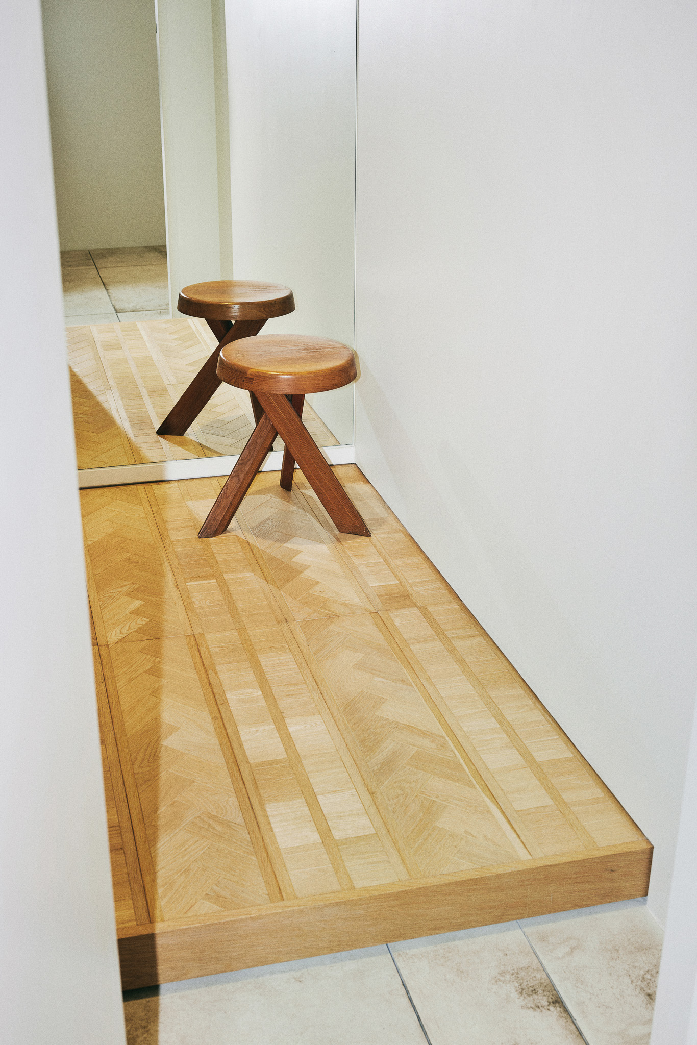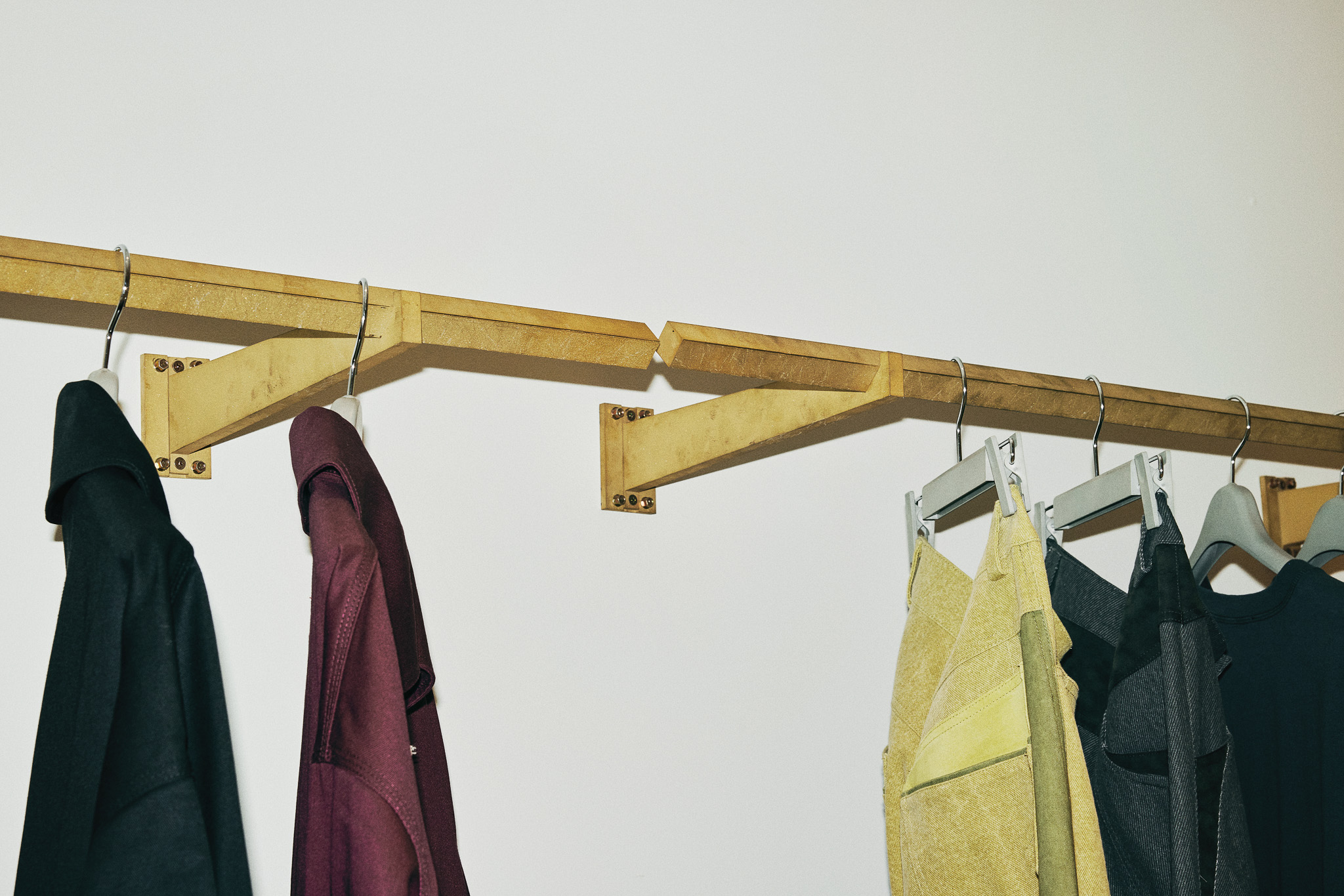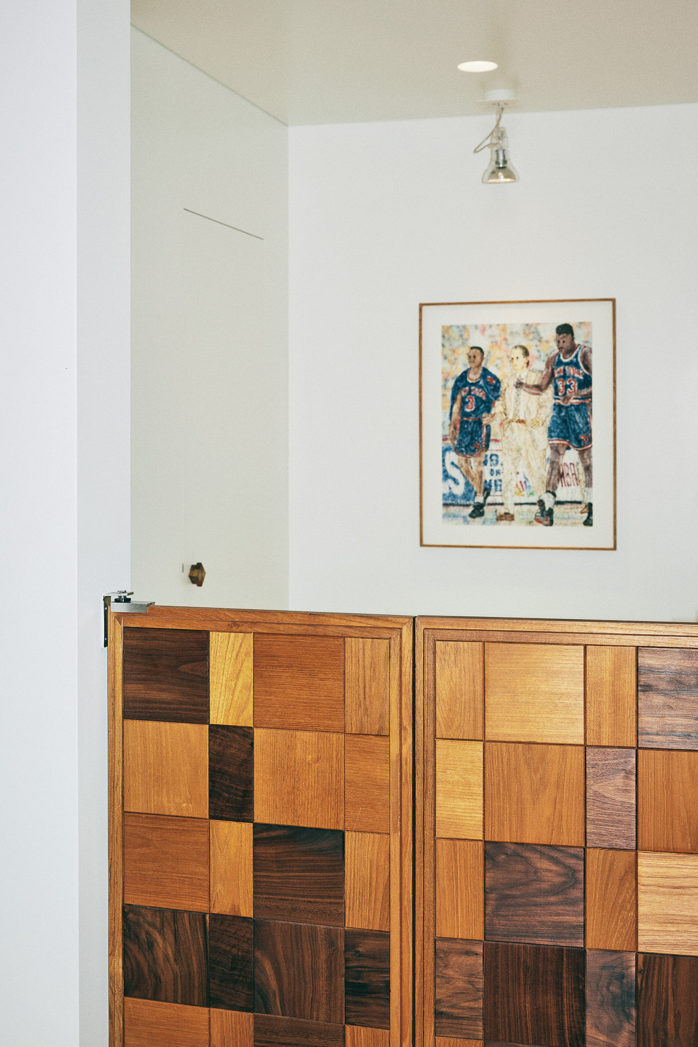 목재 집기에도 공예적인 측면을 부각했습니다. 매대, 옷걸이 등 가구는 짜맞춤 구조와 모따기 가공 등을 활용해 제작했습니다. 스윙도어, 문고리, 거울 등에는 색이 다른 세 가지 종류의 나무를 사용해 모자이크 패턴을 넣었습니다. 오너의 취향을 반영한 농구공이나 코트를 형상화한 무늬죠.