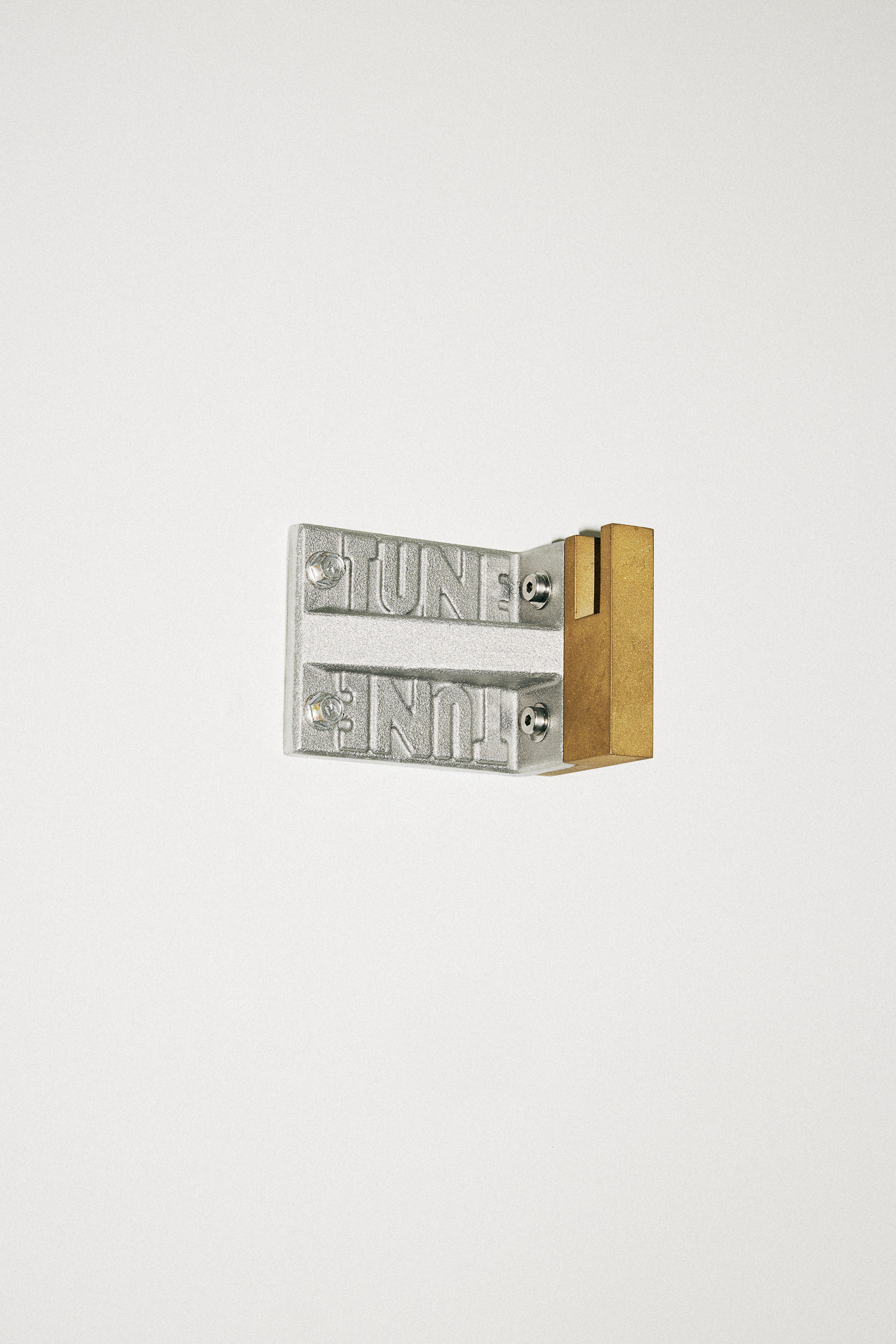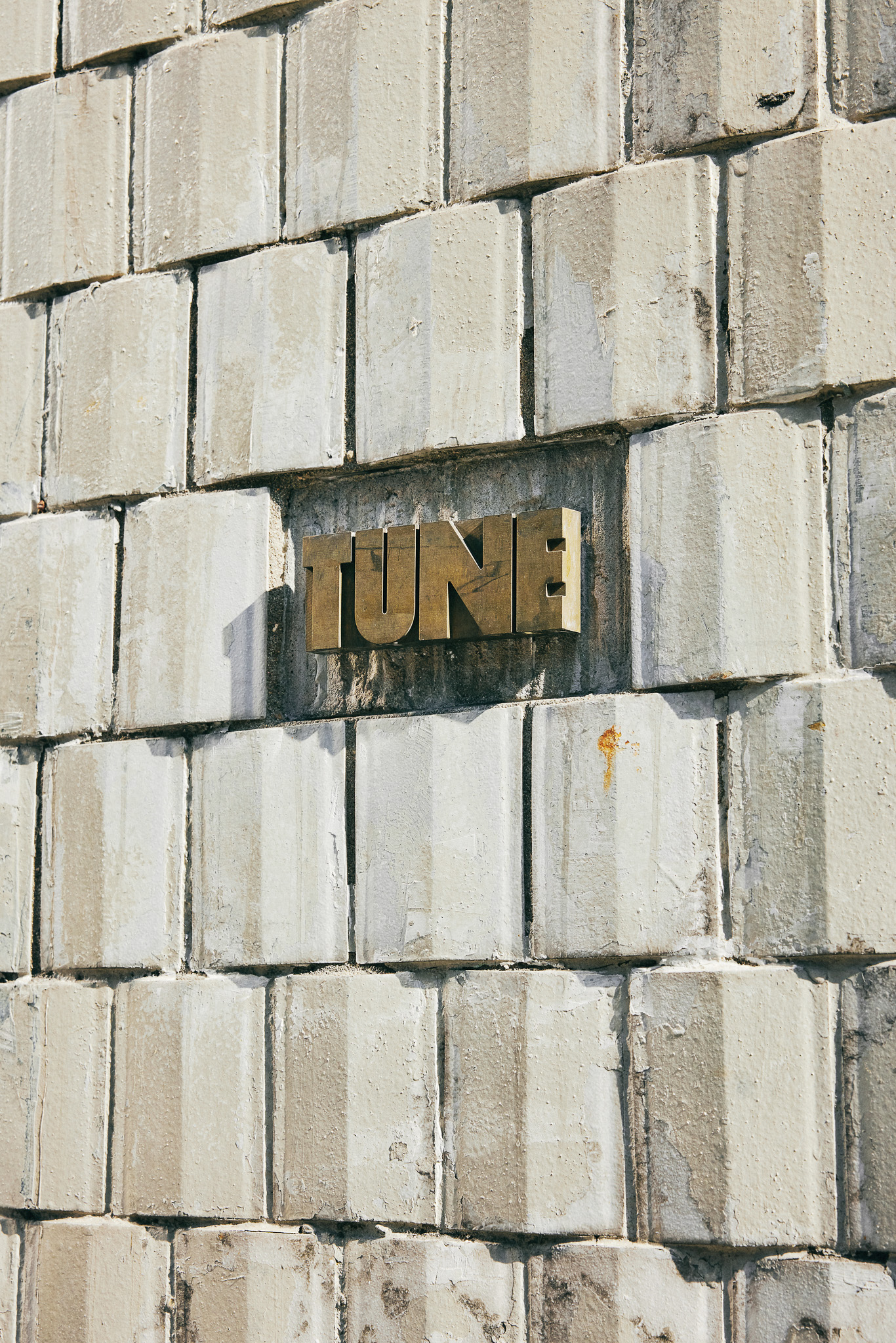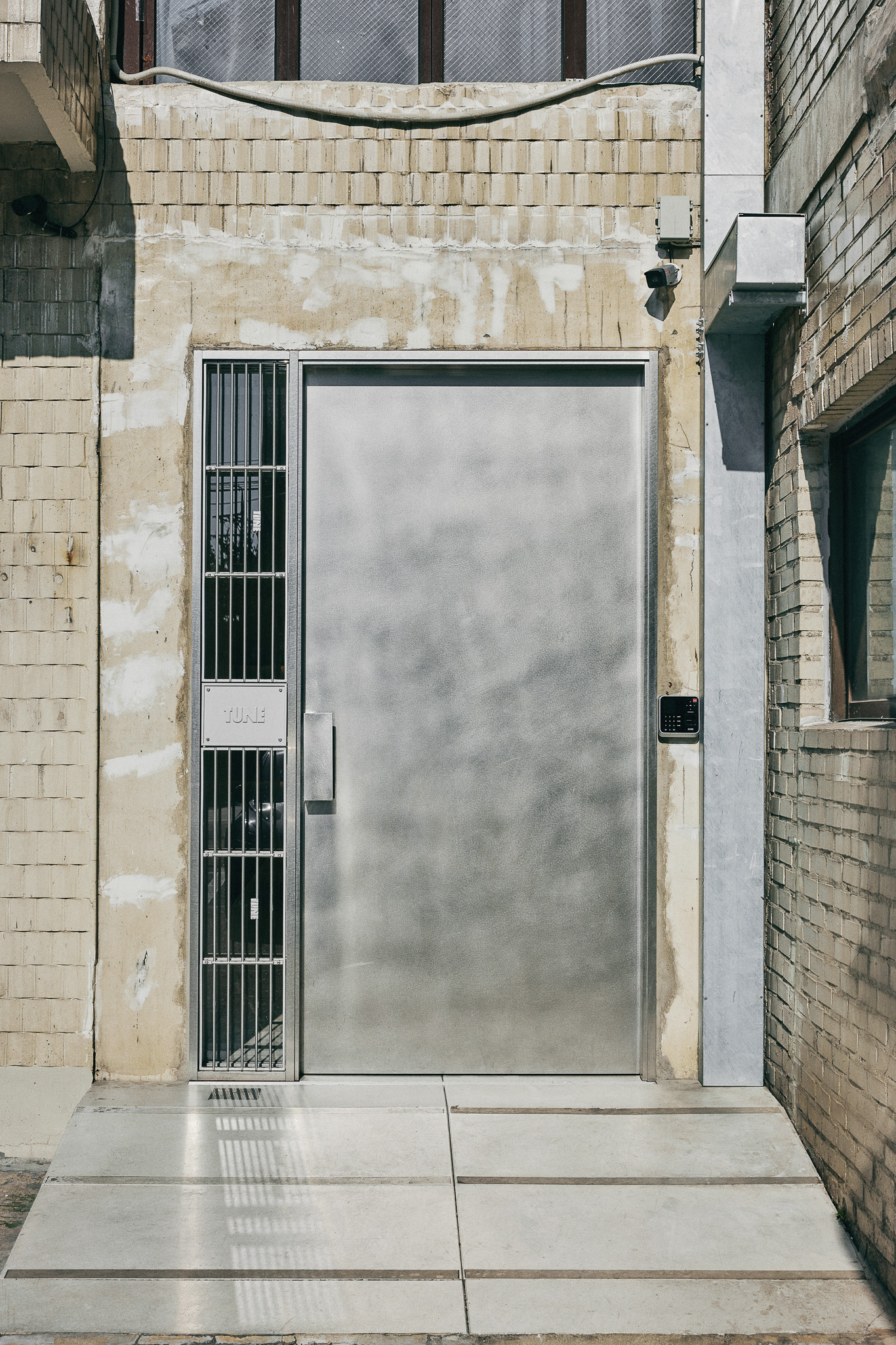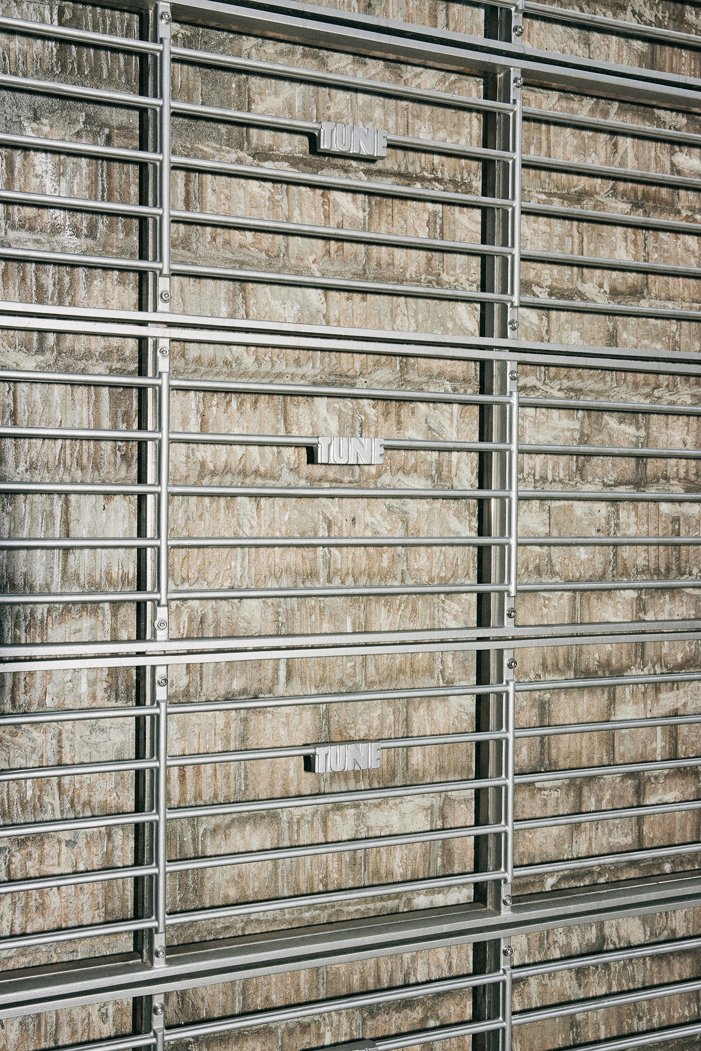 철제 그레이팅과 브래킷을 사형 주조로 제작해 공간 내외부의 주요 요소로 활용하고자 했습니다. 그레이팅은 오선보의 한 마디에 튠 로고가 온쉼표처럼 붙어 있는 모양. 출입구 전면에 배열해 공간의 정체성을 드러내며 내외부를 구분했고, 매장 내에서는 제품 진열용 선반으로 활용했습니다. 브래킷 역시 곳곳에 사용했는데, 특히 건물 외벽에 점 단위 그리드 시스템으로 설치해 현수막 등 대형 홍보물을 자유롭게 탈부착할 수 있도록 한 점이 특징적입니다.