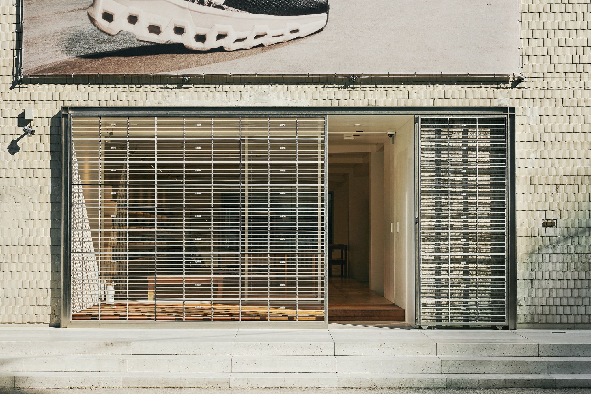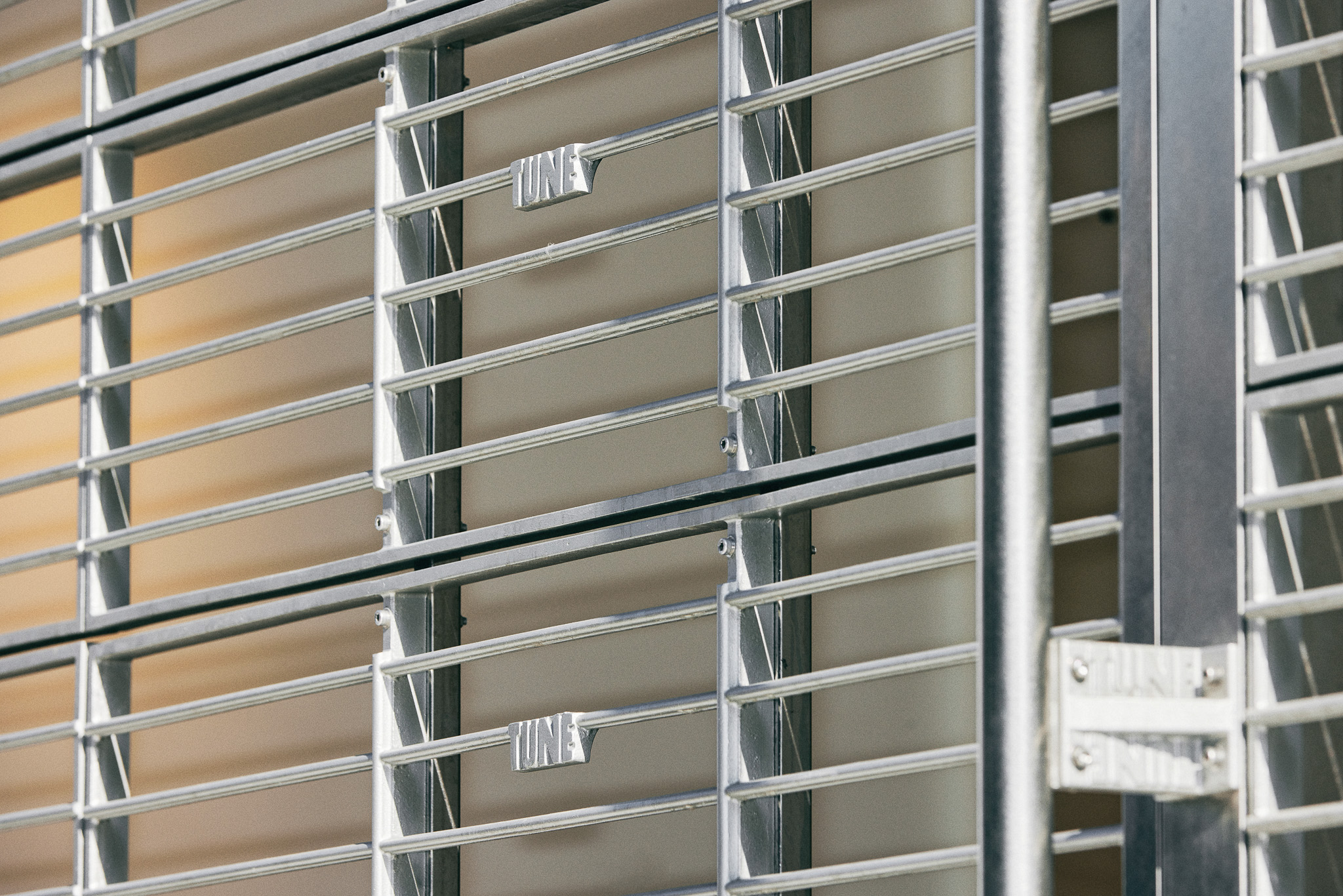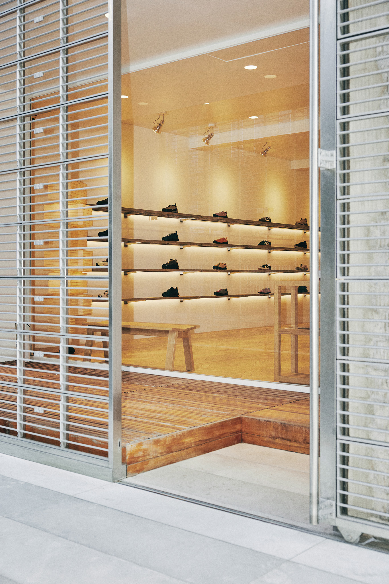 철제 그레이팅과 브래킷을 사형 주조로 제작해 공간 내외부의 주요 요소로 활용하고자 했습니다. 그레이팅은 오선보의 한 마디에 튠 로고가 온쉼표처럼 붙어 있는 모양. 출입구 전면에 배열해 공간의 정체성을 드러내며 내외부를 구분했고, 매장 내에서는 제품 진열용 선반으로 활용했습니다. 브래킷 역시 곳곳에 사용했는데, 특히 건물 외벽에 점 단위 그리드 시스템으로 설치해 현수막 등 대형 홍보물을 자유롭게 탈부착할 수 있도록 한 점이 특징적입니다.