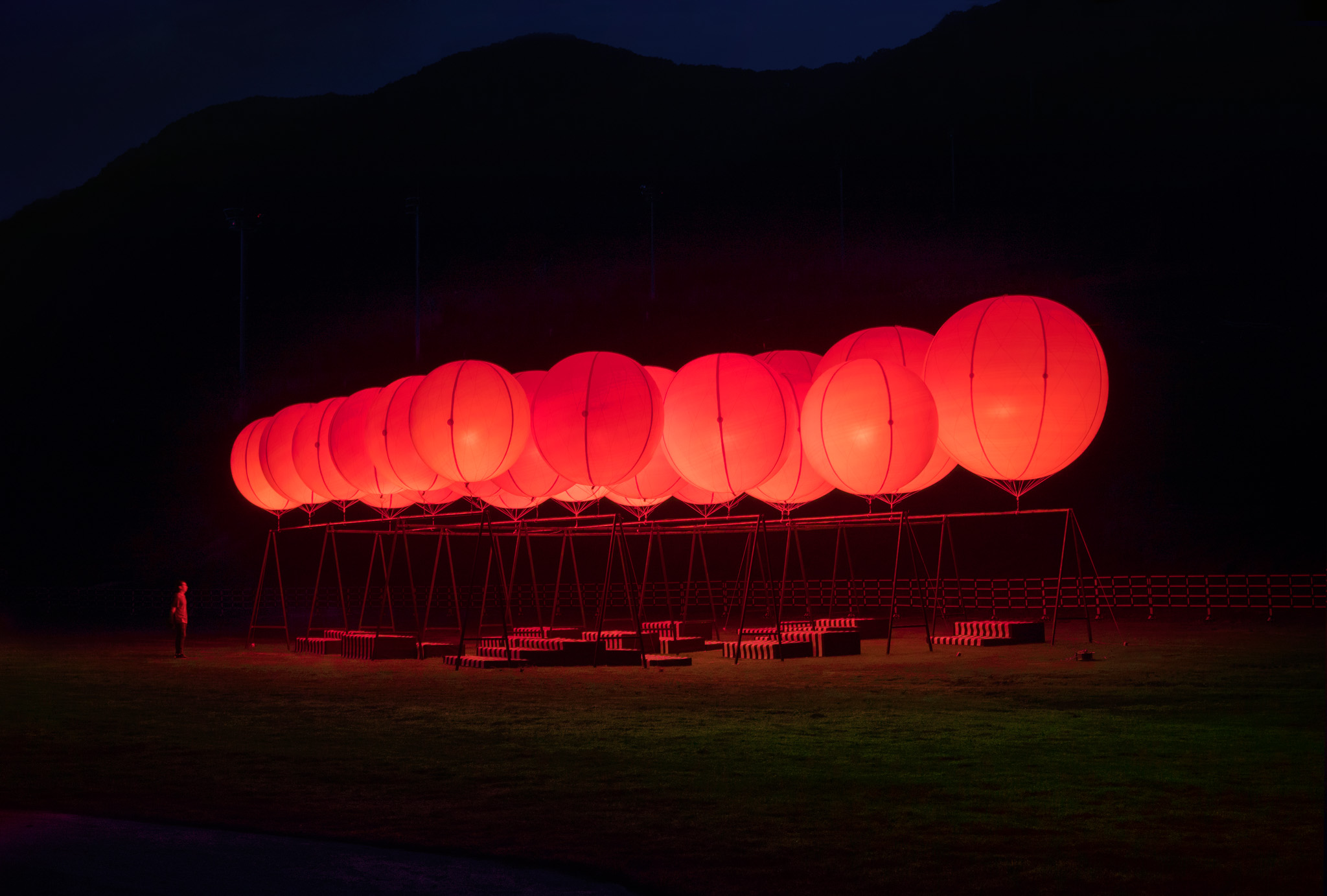 김영나 디자이너의 작업을 바탕으로 락페스티벌 기간 동안 한시적으로 운영되는 일종의 쉼터를 만든 프로젝트. 빨간색 원으로 구성된 김영나의 작업을 일종의 평면도 삼아 조명이 매입된 애드벌룬으로 제작해 그 아래에서 사람들이 쉴 수 있는 공간을 조성했습니다. 바람에 따라 흔들리는 풍선의 모습이 아름답습니다.